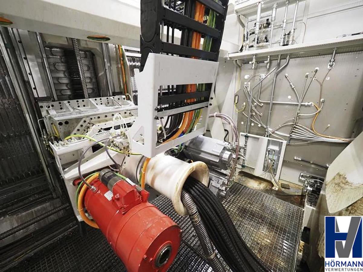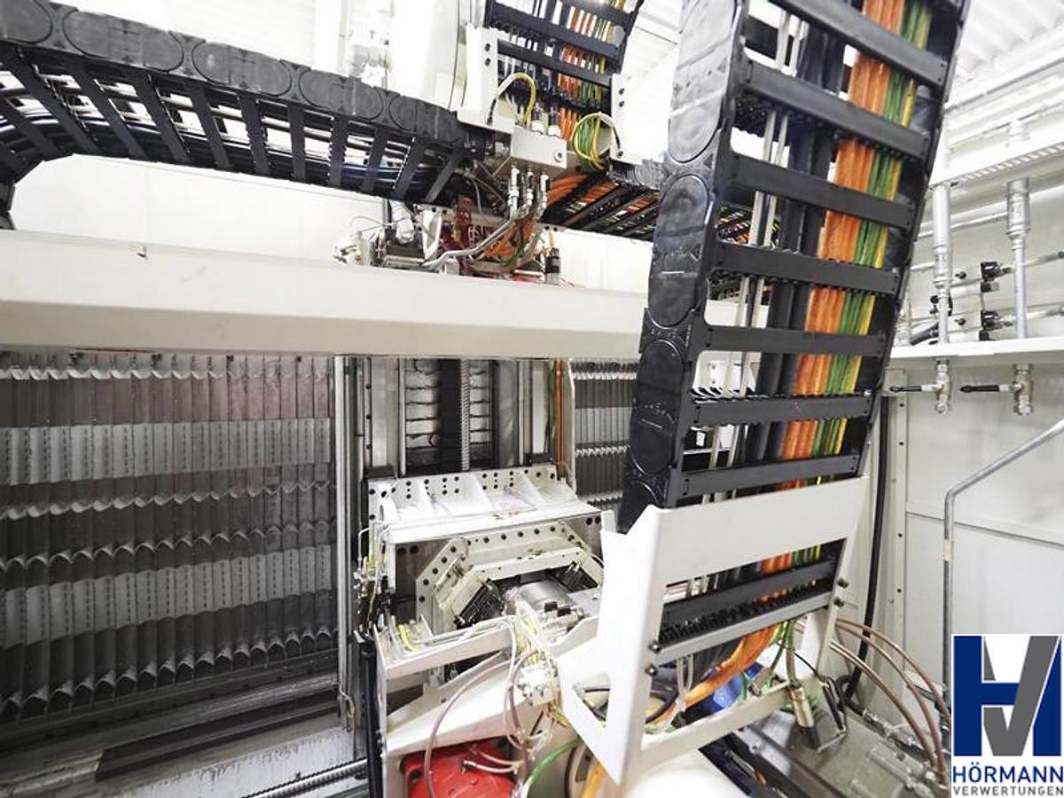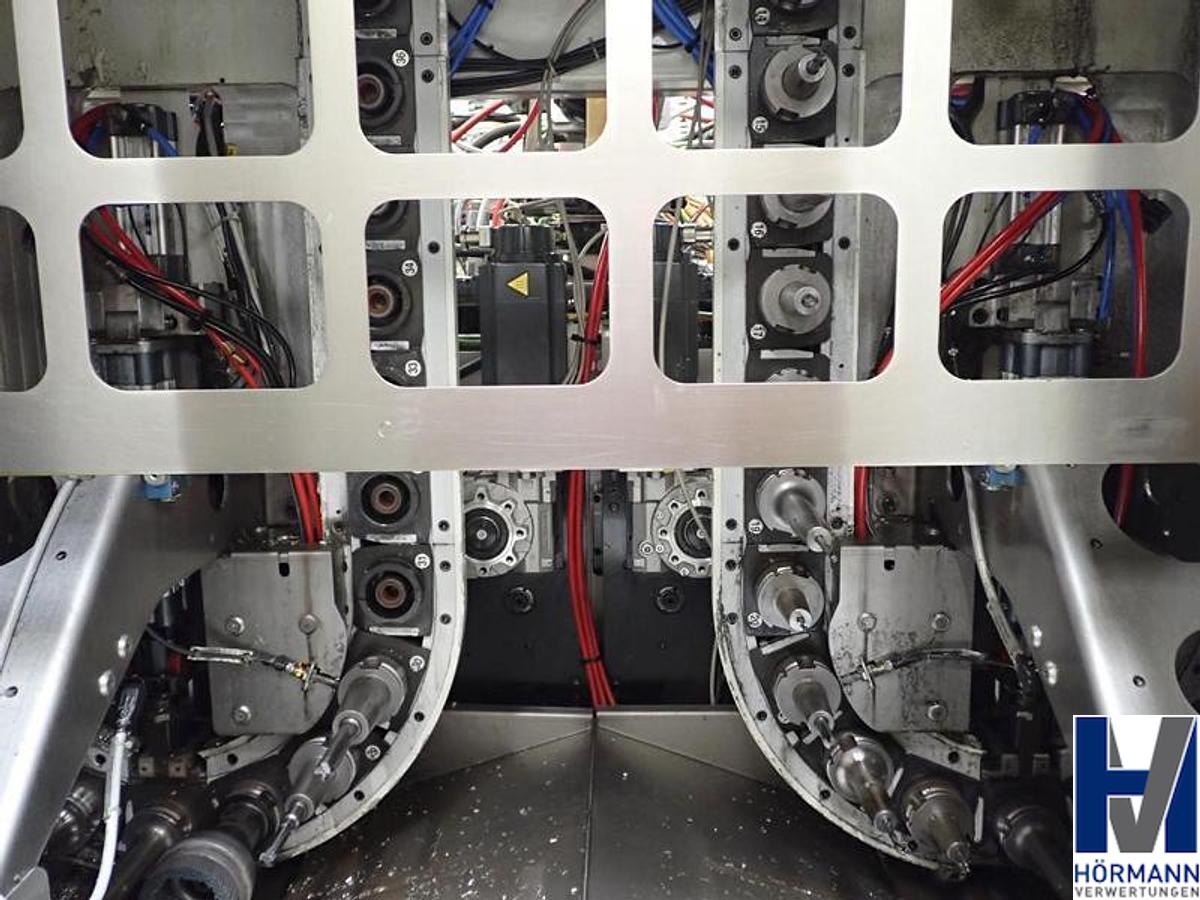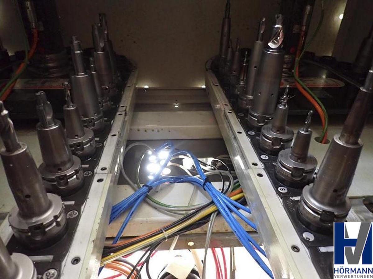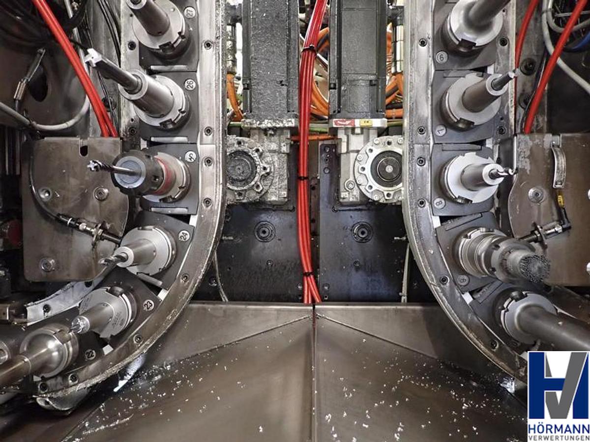 Control system Siemens Sinumerik 840D SL 4 axes and 4 spindles Spindle distance 500 mm Spindle speed max. 15,000 rpm incl. - 4x 40-way tool changer from CFT | Tool holder HSK-63 - Cooling unit from Deltatherm | Type WT Group | Year of manufacture 2016 - Coolant system from BMF | Output 80 bar - Paper belt filter from BMF Type WT-15 | Year of manufacture 2016 - Scraper belt conveyor from BMF | Year of manufacture 2016 The workpiece fixtures in the systems are not part of the advertisement Own weight 28,000 kg, Machine designation: Double spindle machining center, Machine number: AA100164-12, Travel x/y/z: 550x2,000x550mm