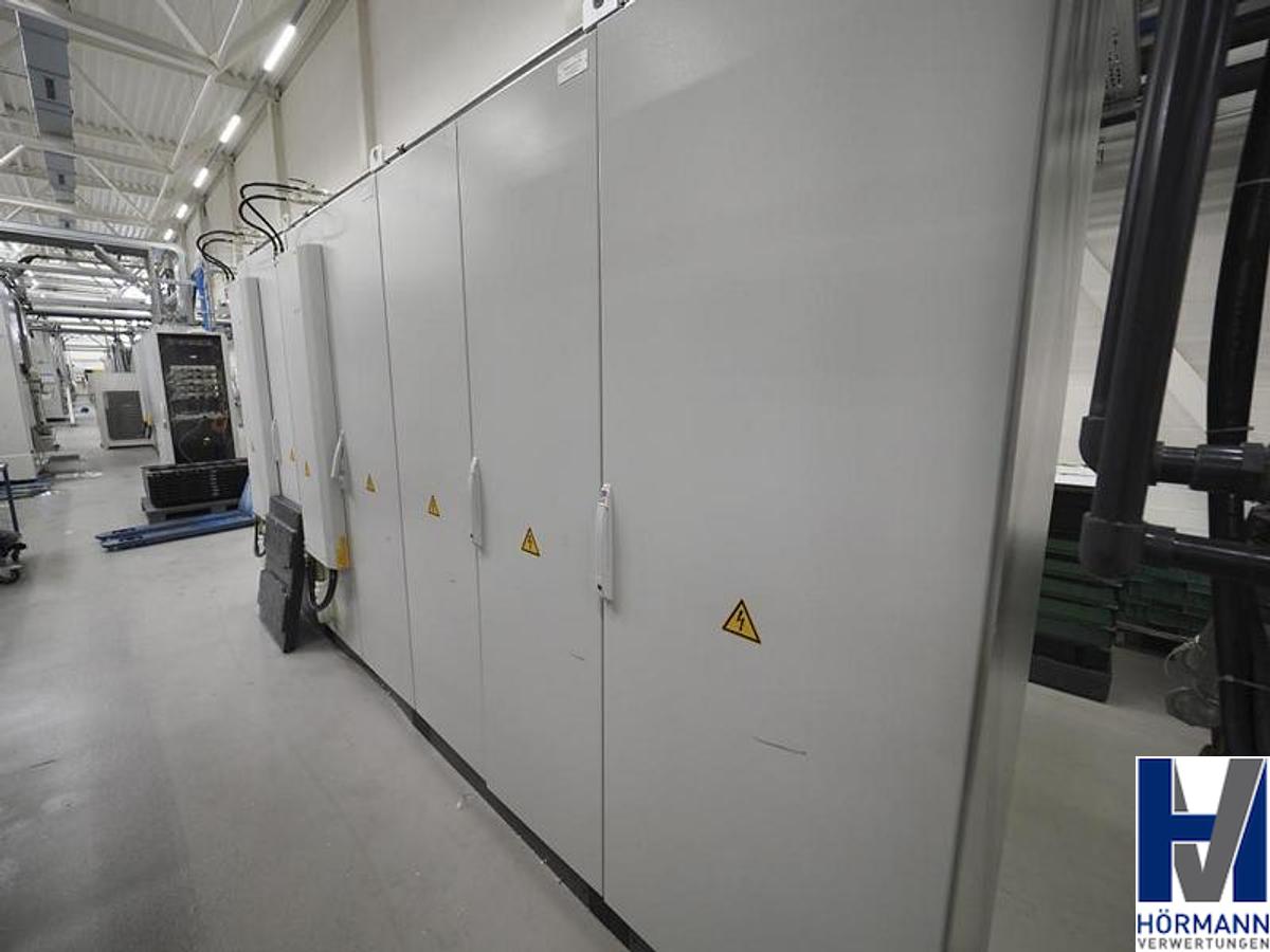 A complete automation system for handling machining center products is available. 1) Full protection cabin with safety door. 2) 6-axis robot Kuka KR 120 R 3200 PA with gripper adapter. 3) 6-axis robot Kuka KR 120 R 3500 with gripper adapter. 4) 2x 6-axis robots Kuka KR 10 R 1420 with gripper. 5) Handling unit with 2 robots. 6) Reference chamber. 7) Marking station with extraction, cleaning station, and assembly unit for 2 lanes. 8) 2x adhesive application stations. 9) 2x screwing stations. 10) Drawer system with part inserts. 11) Pallet storage area. The transfer stations and removal/handling grippers are designed for specific parts. Documentation available. An on-site inspection is possible.