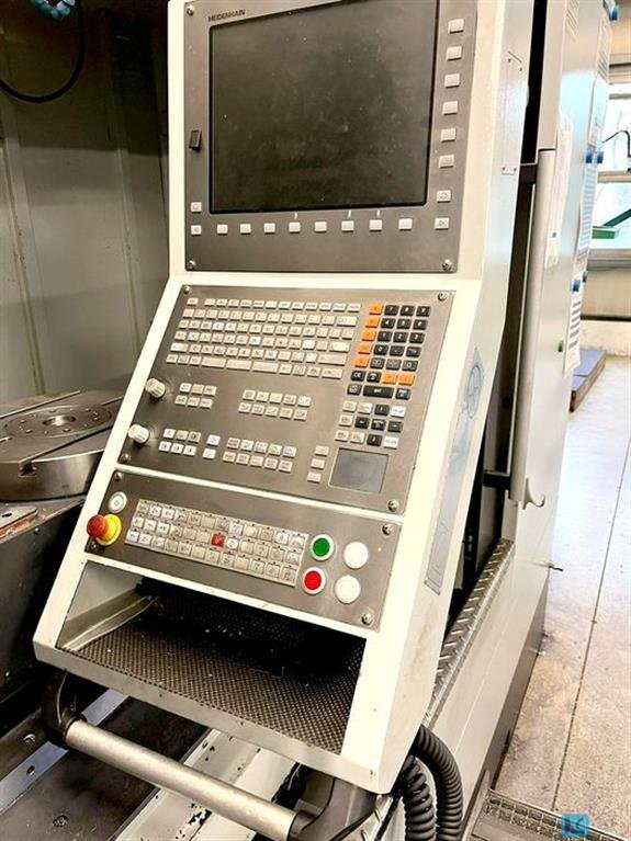 x-travel:960 mm y-travel:600 mm z-travel:480 mm rotary table::D 350 mm table load:200 kg spindle turning speed range:12.000 1/min drive capacity - spindle motor:14/10 kW control:HEIDENHAIN iTNC 530 rapid traverse:32 / 32 / 24 m/min Tool changer:30- fach spindle taper ISO:BT 40 weight of the machine ca.:7,4 t total power requirement:45 kVA dimensions of the machine ca.:3,1 x 2,3 x 3,1 m 5-axis simultaneously universal-machining center, NC-rotary-swivelling table dia. 350mm, A-axis (120/-42°), C-axis 360°, Internal coolant supply, el. handwheel, chipconveyor, direct measuring system, Hour meter: approx. 9.000 h "machine on", approx. 3.500 h "spindle on"