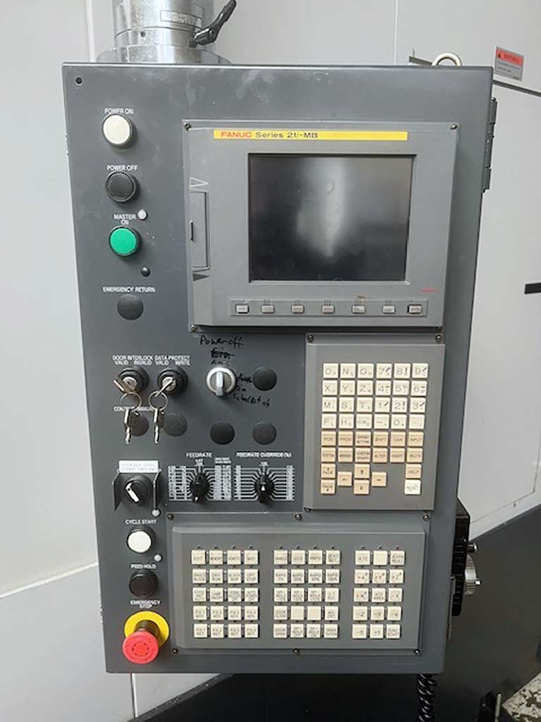 FANUC O1 Comprimento da máquina: 1350 mm Largura da máquina : 2760 mm Altura da máquina : 2615 mm Peso da máquina: 3500 kg Unidade de controle: Enac-I Faixa de velocidade do eixo: 10000 1/min Potência do motor do eixo: 7,5 kW Curso do eixo X: 500 mm Curso do eixo Y: 400 + 210 mm Curso do eixo Z: 300 + 80 mm Carga máxima da mesa: 500 kg Dimensões da mesa: 700 mm x 400 mm