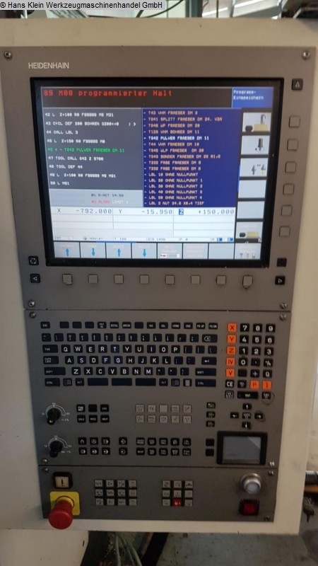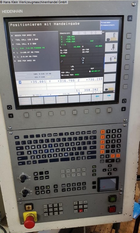 x-travel: 1100 mm y-travel: 600 mm z-travel: 500 mm table surface area: 1300 x 600 mm spindle taper: SK 40 spindle turning speed - stepless: 10.000 U/min ATC: 40 Pos control: HEIDENHAIN, TNC 530 total power requirement: kW weight of the machine ca.: 8,8 t dimensions of machine L x W x H: 2,58 x 3,04 x 2,35 m Accessories: 2 hydr. vices make HILMA, model NC 160, width of jaws 160 mm, various tool holders, chip conveyor, coolant The data for this ad was created with ModulMWS - the software solution of LogoTech oHG.
