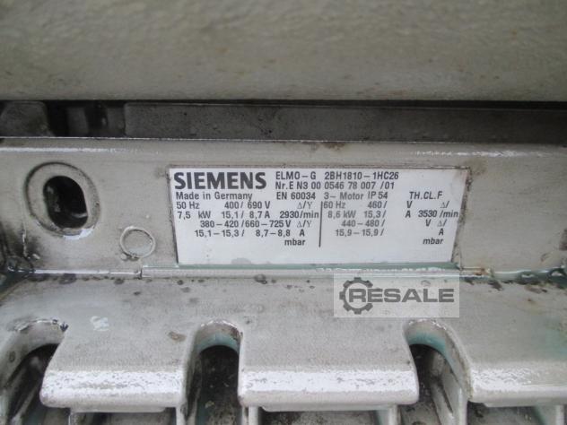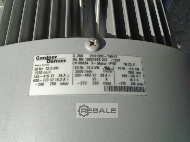 Fabricante: GARDNER DENVER #3289 Tipo: G200 2 BH 1900 -7AH17 Potência elétrica: 12,5 kW RPM: 2920/minuto a 50Hz Pmin: 280 mbar