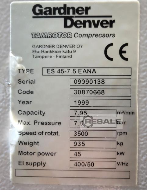 Tamroter Compressor de Parafuso Jardineiro Denver Tipo ES 45-7.5 EANA ano 1999 S/ N 09990138 Manutenção de Deus Capacidade 7,95 m3/ min motor 45 kW Tensão 400 V/ 50 Hz peso 935 Kg Marcação CE