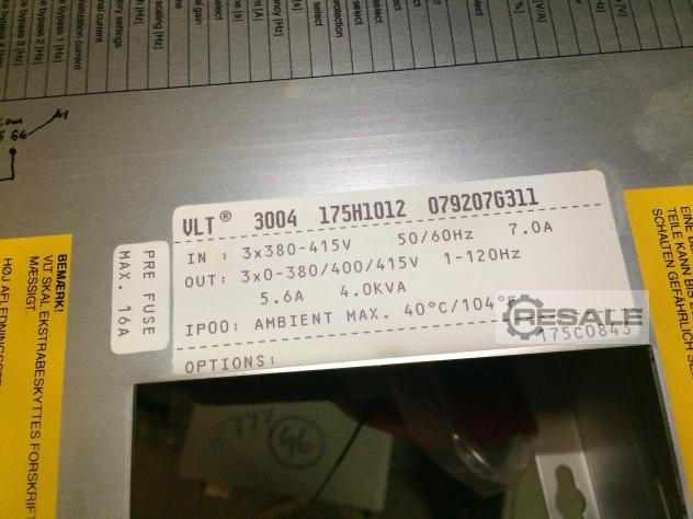 Fabricante: Danfoss Tipo: VLT3004 175H1012 079207G311 Potência elétrica: 3,6 kW