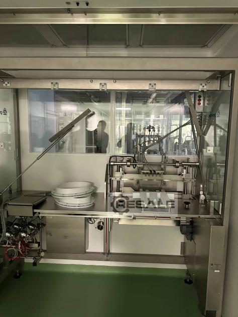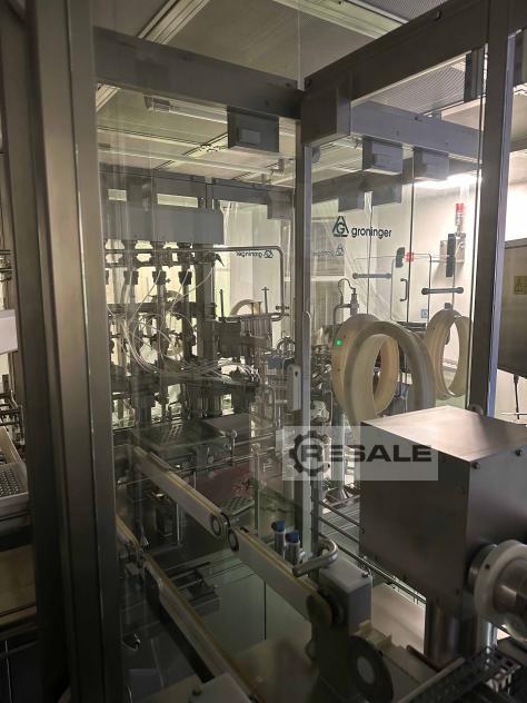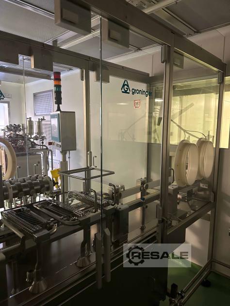 Linha de produção Groninger para seringas aninhadas (RTU) composta por desembaladora de sacos semiautomática MWU 010, máquina de enchimento/delineador automática MWF 100 e máquina de enchimento e selagem DFVN 5000 (sistema CIP/SIP, sistema de enchimento RKP com recirculação adequada para suspensões, etc.), capacidade de até 9.000 objetos por hora Incluindo peças de formato para processamento das seguintes seringas: 0,5ml / D=6,85mm 1ml de comprimento / D=8.15mm 1ml curto / D=10.85mm 2,25ml / D=10,85mm 5ml / D = 14,45 milímetros 10ml / D=17,05mm 50ml / D=31,5mm