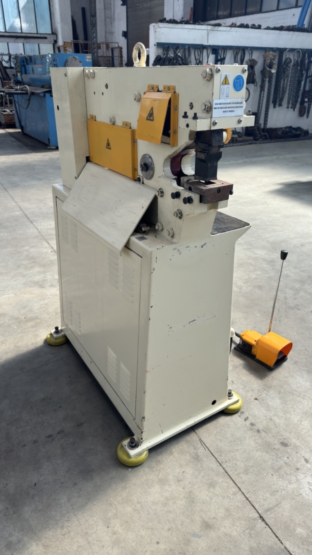 Hidr . Tesoura de aço de perfil plano e barra com dispositivo de entalhe e perfuração de furos Especificações: - Tesoura plana em aço cortada até 375 x 10 mm - 220 x 20 milímetros - Tesoura de perfil em aço - corta aço L a 90 a 130 x 13 mm - Tesoura em barra de aço - corta aço redondo até 45 mm - Aço quadrado até 45 mm - Dispositivo de entalhe - com dispositivo de entalhe quadrado 100 x 42 x 10 milímetros - Furo - força de perfuração 600 KN - com mesa de paragem - Projeção 300 mm - punções em aço até 28 mm em 15 mm - ou 34 mm em 12 mm - paragem manual - Acionamento 400 V / 4 kW - Necessidade de espaço aprox. L 600 x A 1550 x P 1500 mm - Peso aprox. 1300 quilogramas