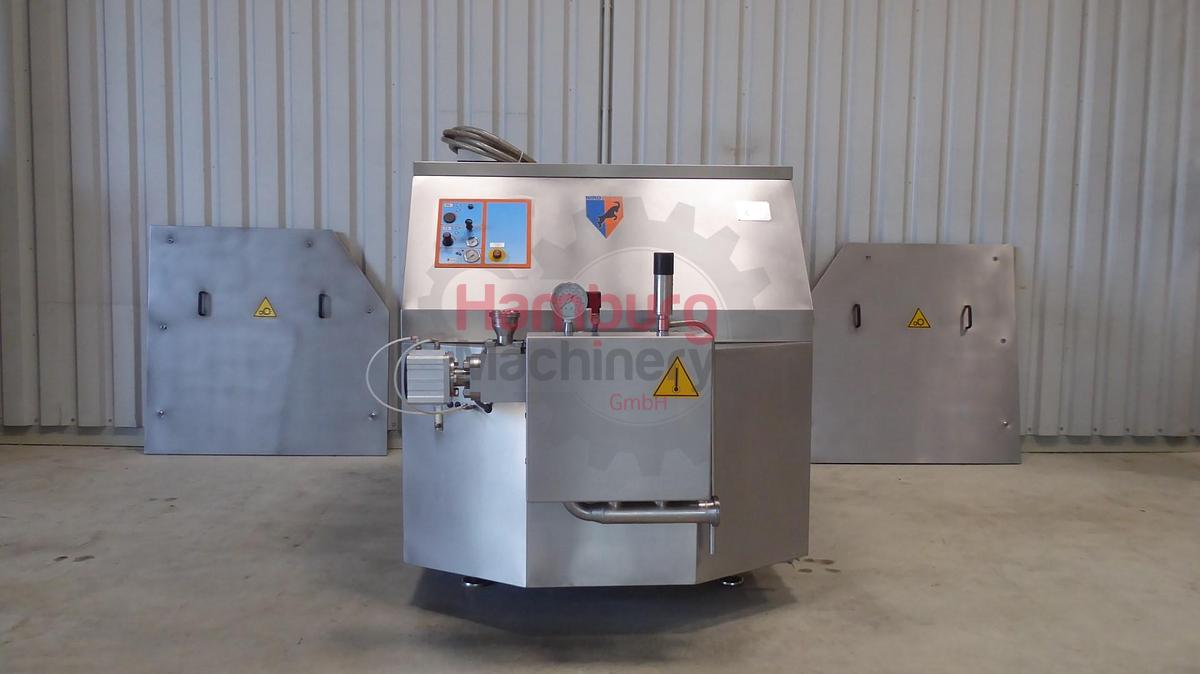 This APV Gaulin 264 MC 15-8TBS homogeniser is a 3-cylinder machine which is designed for 1.000 liter per hour with a maximum pressure of 500 bar. The homogensier is equipped with 2-stages with ball valve cylinder, 1 stage hydraulic controlled, 1 stage manual controlled. Manometer. Motor: 22 kW - 380 V - 44 Amp - 50 Hz - 1.465 rpm. Stainless steel cladded. Oil pumping system outside the machine., Type of Machine: Homogeniser, Capacity: 1.000 liter per hour, Stages: 2 Stages, Max. Pressure: 500 bar, Valve cylinder: Ball valves, Product: Dairy, Piston diameter: 51 mm, Motor: 22 kW - 380 V - 44 Amp - 50 Hz - 1.465 rpm, Dimensions: 180 x 110 x 180 cm, Weight: 2.115 kg