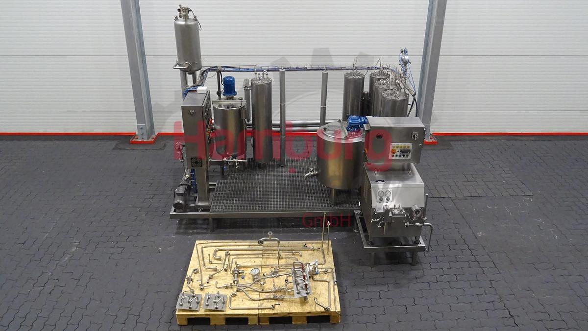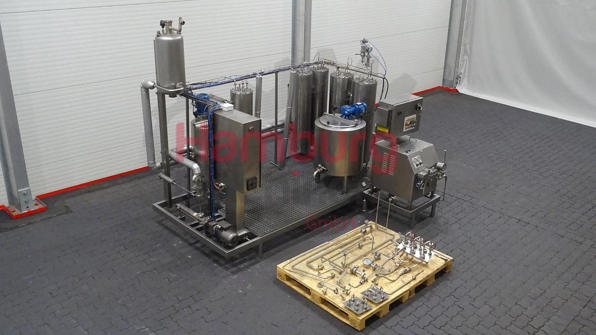 This skid mounted pilot pasteurisation plant exisiting out of a inline filter, feed screw pump (Bominox - type RS-22/M - 0,75 kW - n2: 250 rpm), level tank of ± 100 liter (internal diameter 45 cm, internal height 70 cm) with mix agitator (0,18 kW - 665 rpm), pre-heater (tubular heatexchanger), homogeniser (FBF 001), 2x tubular heaters, holding, 2 tubular coolers and a double jacketed ripening tank of ± 250 liter (internal diameter 70 cm, internal height 63 cm) with propellor agitator (0,37 kW - n2: 50 rpm). The pilot pasteurisation plant is previously used for ice cream mixture and only run for 357 production hours., The unit can be used for all kind of different combinations for pasteurisation and homogenising of liquid products, by making different connections on the flowplates., Homogeniser details:, Manufacturer: FBF Italia, Model: FBF 001, Serienr: 06031808, Year: 2006, Max. capac ...