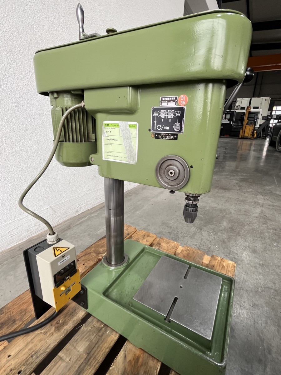 bore capacity in steel (diameter): 25.0 / 30.0 mmthroat: 150 mmbore stroke: 120 mmthreading: M18 / M22 spindle taper: 3 MKtable:: 300 x 270 mmturning speeds: 200 - 4.000 U/mincolumn diameter: 100 mmtotal power requirement: 0.75 / 1.1 kWweight: 170 kgrange L-W-H: 800 x 500 x 1400 mm from a training workshop () New price approx. 4.700 eurosFurnishing:- robust bench drill with V-belt drive- Clamp / relax using a quick release lever- stepless speed adjustment- digital speed display- EMERGENCY OFF push button at the front- stable feed handle- stable quill for tool mounting- Thread cutting device- Right / left running of the work spindle- Pole changing motor- manual spindle feed- Height-adjustable work table, using a hand crank- adjustable drilling depth stopThe data for this ad was created with ModulMWS - the software solution of LogoTech oHG.