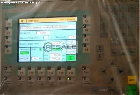 A máquina perfuradora de perfil INTESO S3130T foi fabricada em 2011 na República Checa. Parâmetros técnicos: - Diâmetro interno máximo da bobina metálica da chapa: 80 mm - Comprimento máximo do produto acabado: 3000 mm Dados técnicos: - painel de controlo de ecrã: SIEMENS - comprimento máximo dos perfis: 3000 mm - secção transversal máxima de perfis perfurados: 120 x 80 mm; fi 80 mm - alimentação linear automática - sensor ótico para controlo automático do comprimento correto da peça - posicionamento linear do curso de cilindro hidráulico - tecnologia de perfuração não deformada - a possibilidade de perfuração de perfis de várias formas - memória de programas de perfuração - perfuração de duas faces (numa operação) e perfuração unilateral - lubrificação automática - pressão máxima da prensa hidráulica na linha: 147 kN (15 tonela ...