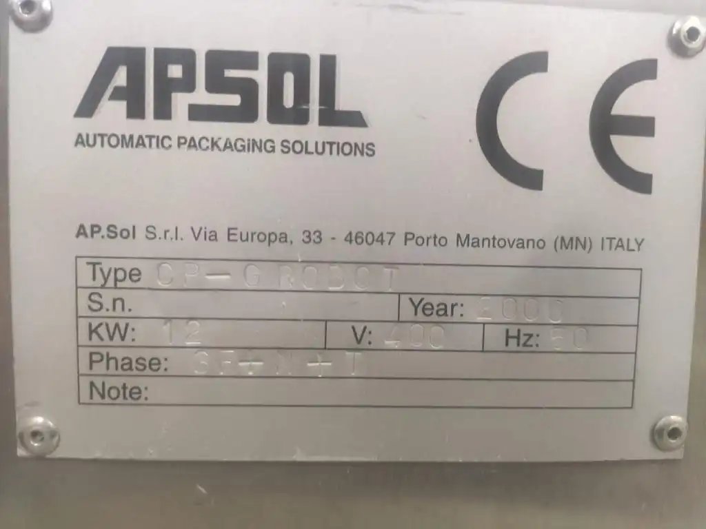 Used Palletizer APSOL CP-G ROBOT 800 boxes/hour The APSOL CP-G ROBOT automatic palletizer provides a highly efficient solution for handling and palletizing boxes, particularly suited for the sparkling wine industry. This model, used until 2023 in a sparkling wine production line, delivers high ...