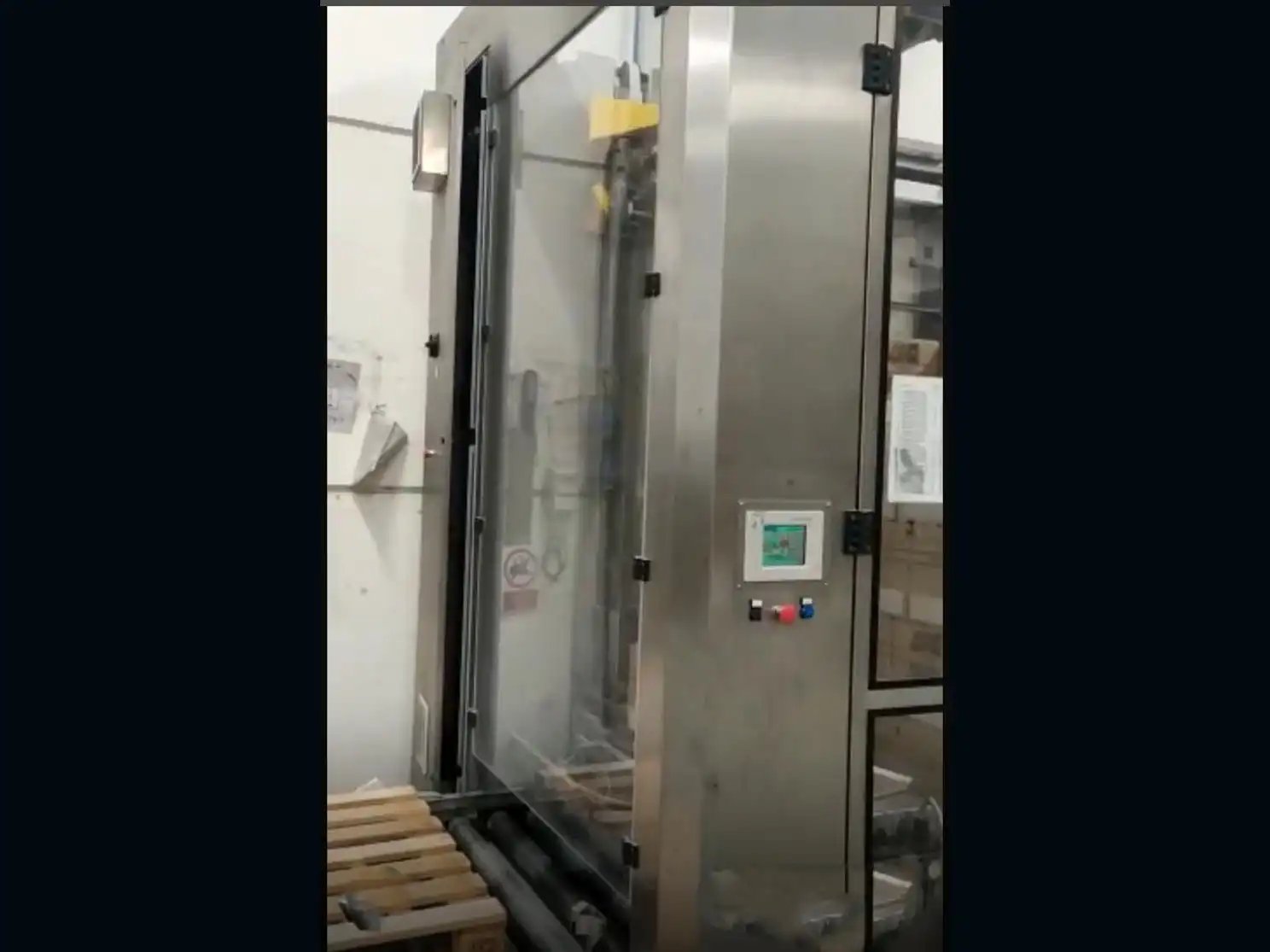Used Palletizer APSOL CP-G ROBOT 800 boxes/hour The APSOL CP-G ROBOT automatic palletizer provides a highly efficient solution for handling and palletizing boxes, particularly suited for the sparkling wine industry. This model, used until 2023 in a sparkling wine production line, delivers high performance while maintaining the robustness and safety typical of the APSOL brand. Palletizer Capacity and Operation The palletizer operates with a capacity of 800 boxes per hour, which is crucial for production lines that require fast and effective load management. It relies on an advanced robotic system, which enables precise movement on three axes, ensuring smooth and error-free operation. Additionally, the three-axis movement system offers excellent flexibility and greater precision in palletizing operations, minimizing the risk of product damage. Handling System and Box Infeed The pallet infeed uses a motorized roller conveyor, which ensures continuous and uninterrupted movement. Similarly, the outfeed of full pallets is managed by a motorized roller conveyor, which allows quick and efficient pallet unloading. The box infeed system employs single-lane feeding, equipped with a motorized roller conveyor and a separator, optimizing box distribution and handling. Structure and Safety Features of the Used APSOL Palletizer The palletizer’s structure consists of painted steel with stainless steel cladding, ensuring long-lasting resistance and effective protection against corrosion, especially in production environments that require high hygiene and durability standards. Moreover, safety guards protect operators, ensuring their safety, which is essential in any industrial facility. Control Panel and Operation Type The equipment, which features integrated control panels, is easy to manage and offers continuous monitoring of operations. Due to its fixed operation type, the palletizer is ideal for installation in production environments where consistency and stability are essential. Consequently, it has maintained high reliability until 2023, ensuring excellent performance despite regular use. Pallet Size Flexibility and Supported Dimensions The Used Palletizer APSOL CP-G ROBOT 800 boxes/hour supports a variety of pallet sizes. It accommodates standard pallets such as Eur-Epal 800×1200 mm, and also specific sizes like Cp1 (1000×1200 mm), Cp2 (800×1200 mm), and Cp3 (1140×1140 mm). It can also handle pallets of varying sizes, such as Cp4 (1100×1300 mm), Cp5 (760×1140 mm), and larger formats like Cp7 (1300×1100 mm) and Cp8 (1140×1140 mm). The flexibility in supported sizes makes this palletizer versatile and suitable for various operational needs. Condition and Availability of the Used APSOL Palletizer The palletizer is currently in storage, ready for installation or adaptation to new production lines. Additionally, all safety features and manuals are available for proper installation and maintenance, ensuring that the equipment complies with safety regulations. Conclusions and Advantages of the Used Palletizer APSOL CP-G ROBOT This used palletizer provides a valuable option for those seeking a high-performing and durable machine, with a production capacity of 800 boxes per hour, without compromising safety or the quality of the APSOL brand. Installing it in a new production line will significantly increase operational efficiency while reducing the risk of human errors during the palletizing process.