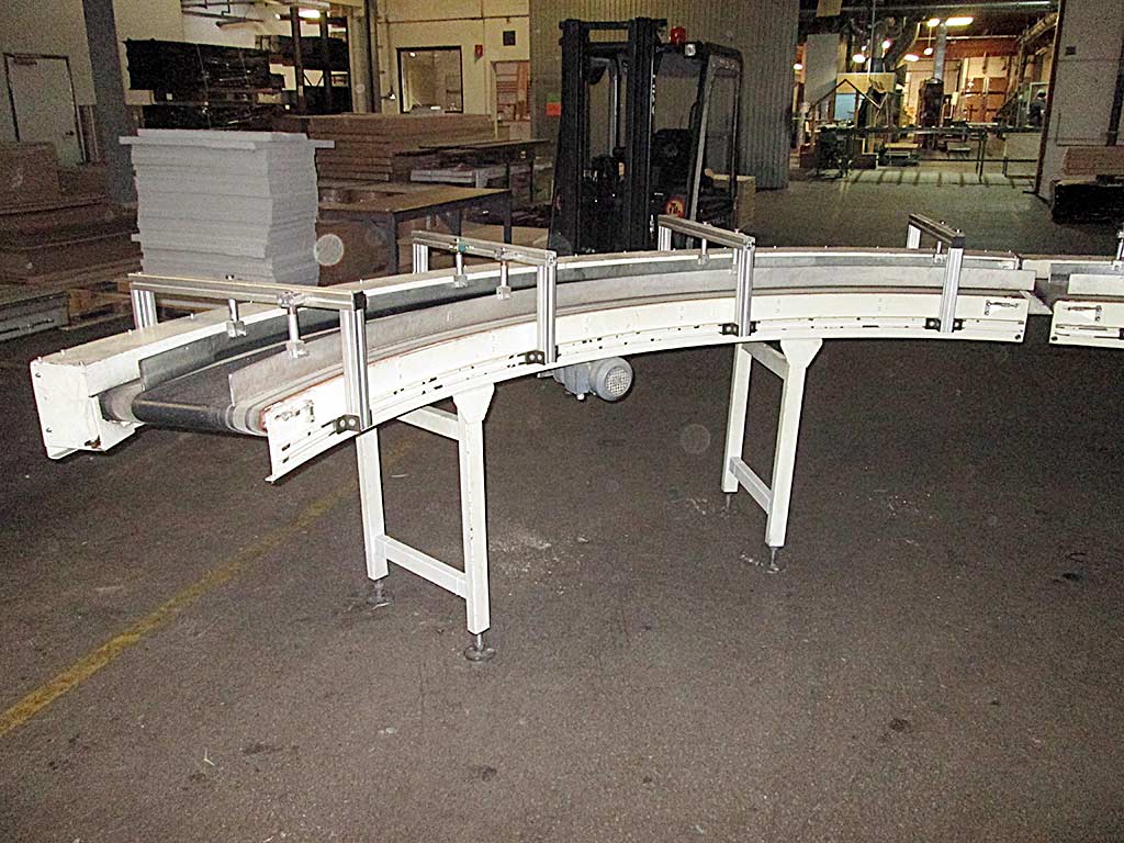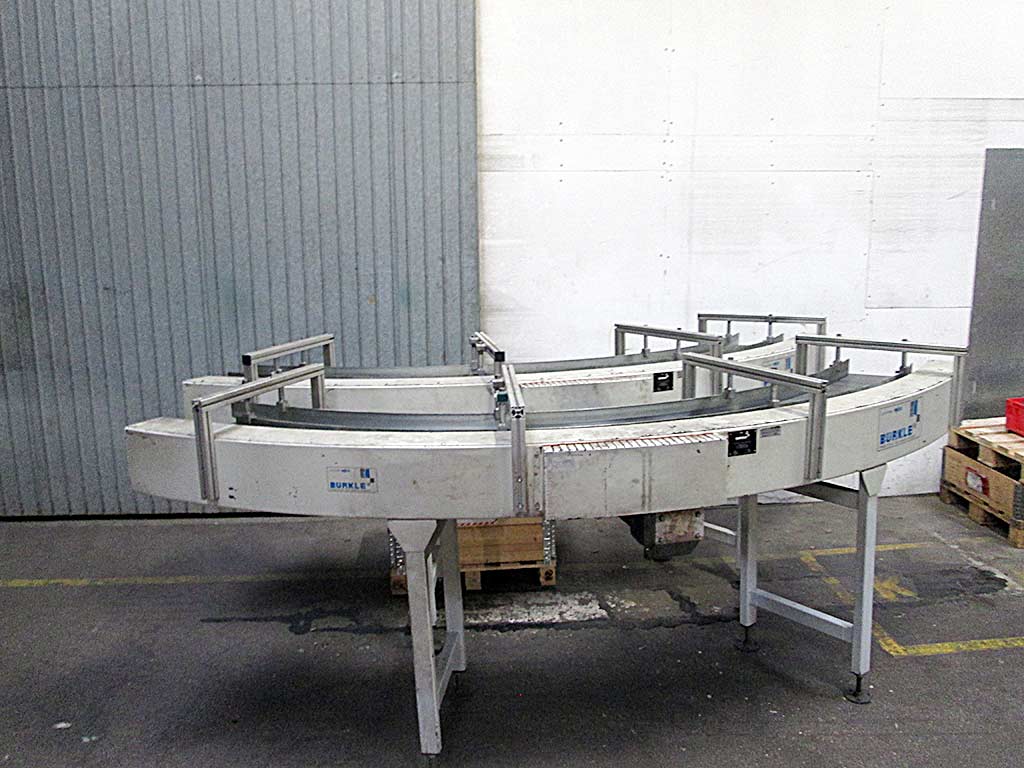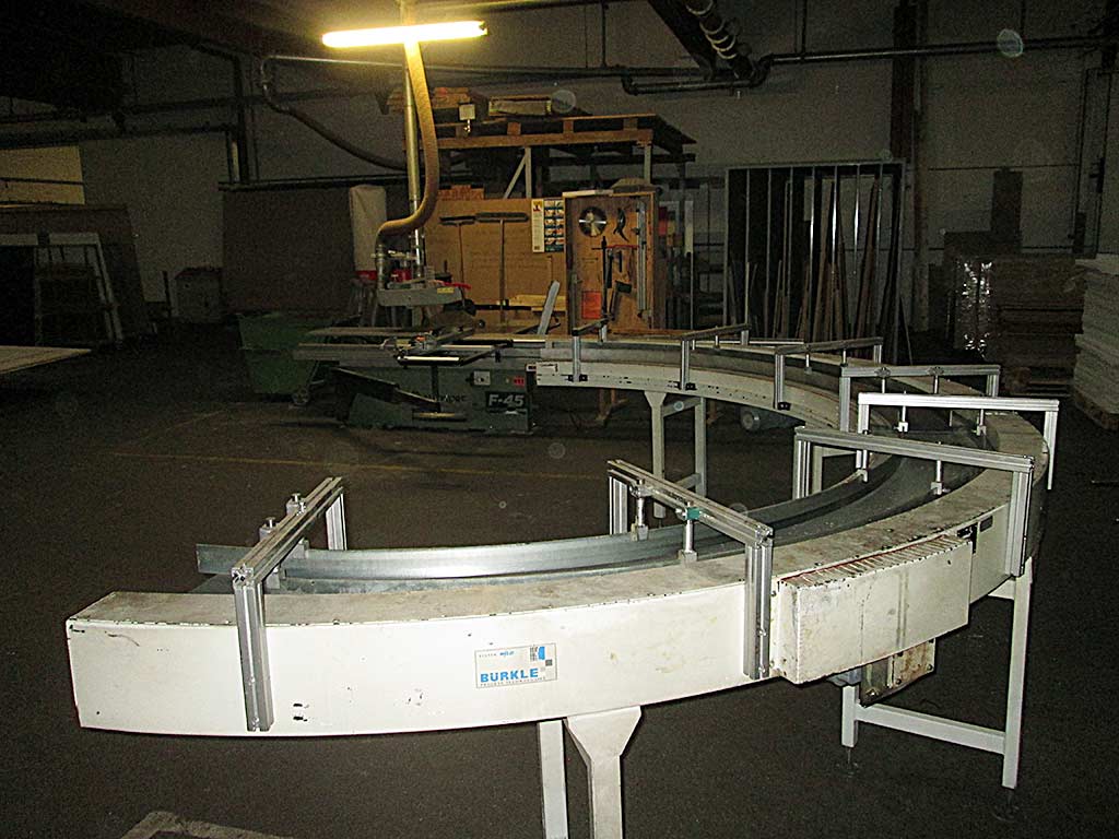Two identical Burkle curved belt conveyors are available. Effective width: 400mm, length: 1800mm, feed rate: 37m/min, curvature: 90°. Documentation available. On-site inspection is possible.