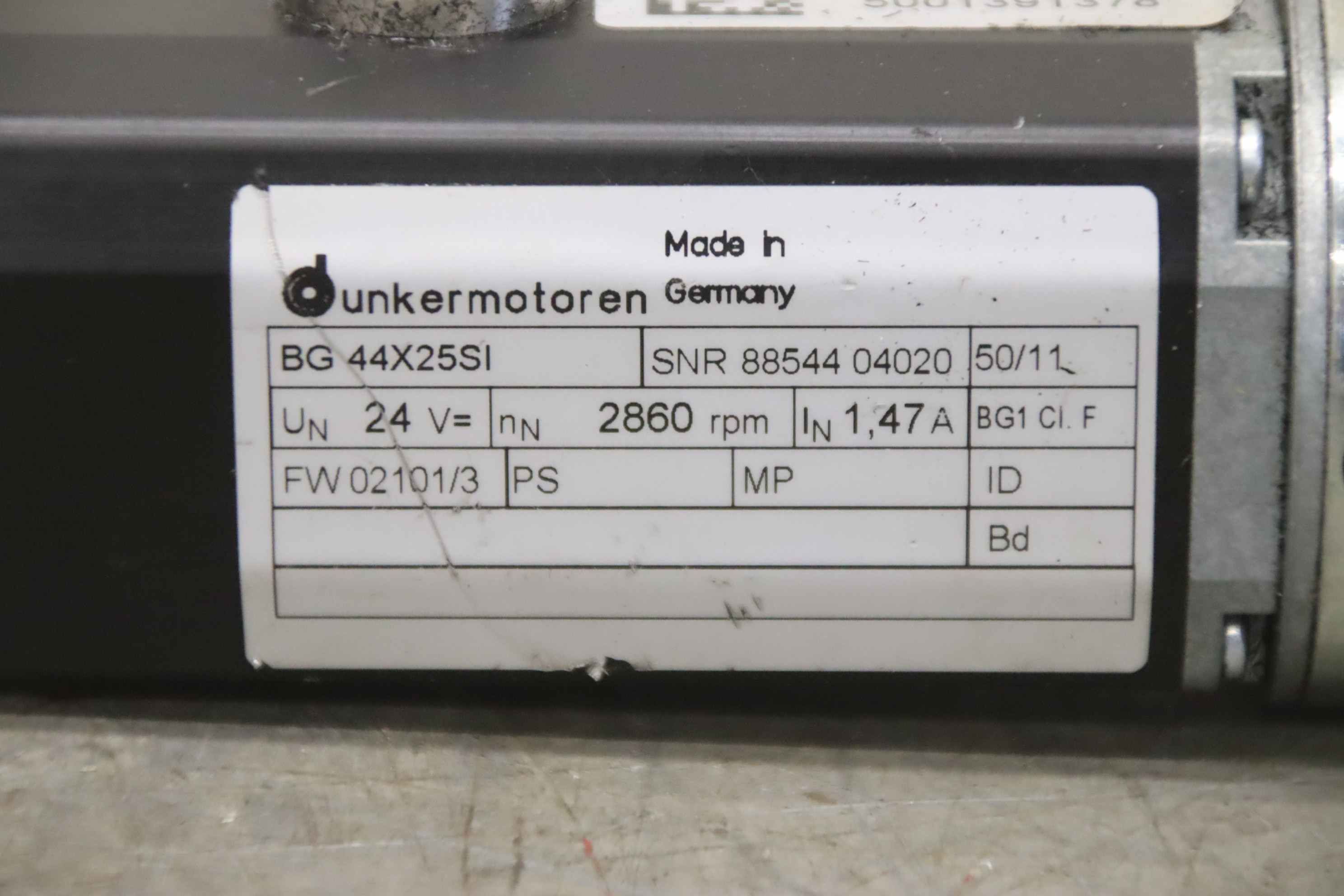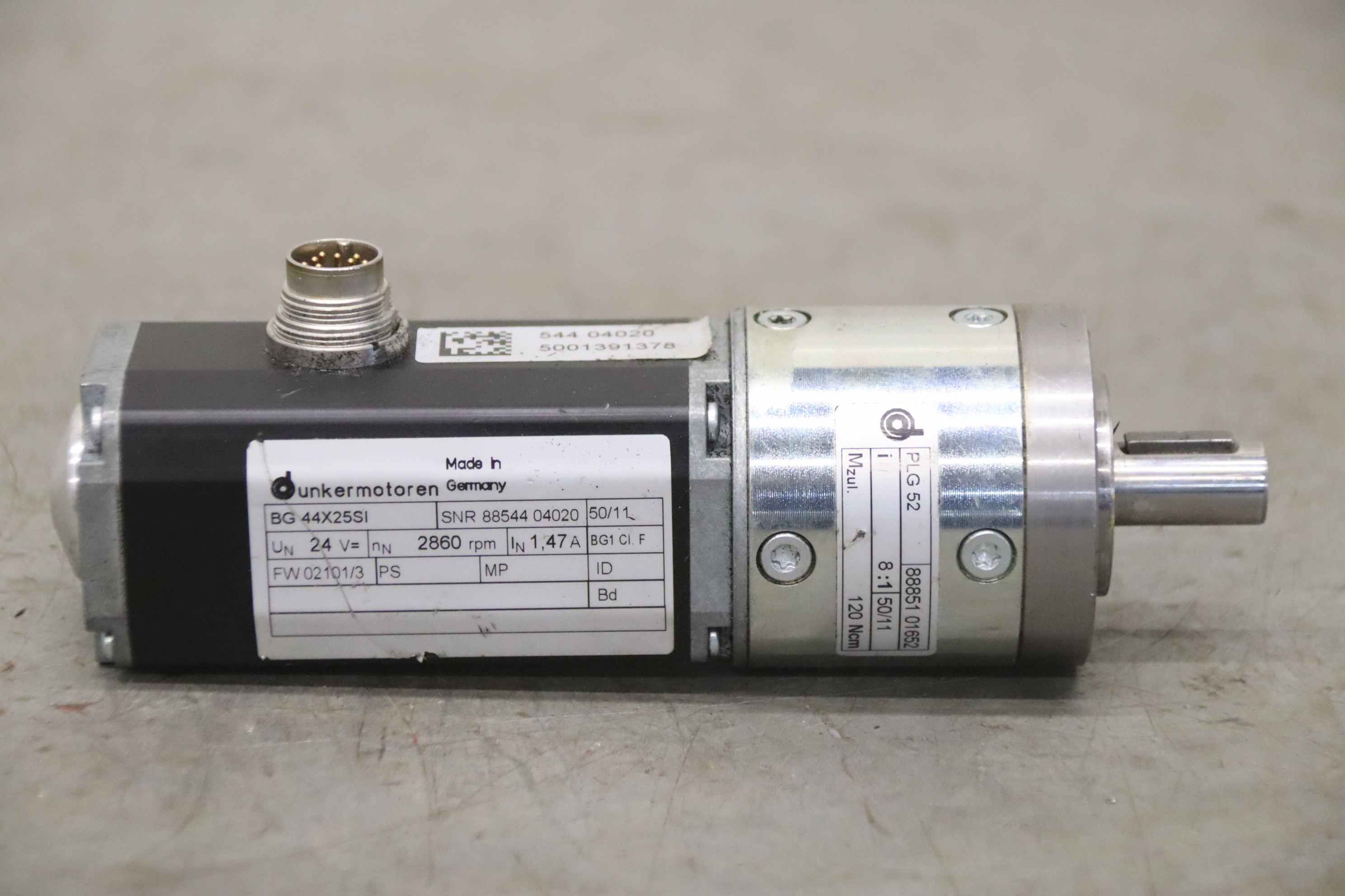 Servo motor, electric motor, DC motor, servo geared motor -Manufacturer: Dunkermotoren, servo geared motor -Type: BG 44X25SI -Voltage: 24 V -Speed: 2860 rpm -Gearbox: PLG 52 i = 8:1 -Shaft: Ø 12 x 22 mm -Number: 7x geared motors available -Price: per piece -Dimensions: 172/58/H52 mm -Weight: 1.1 ...