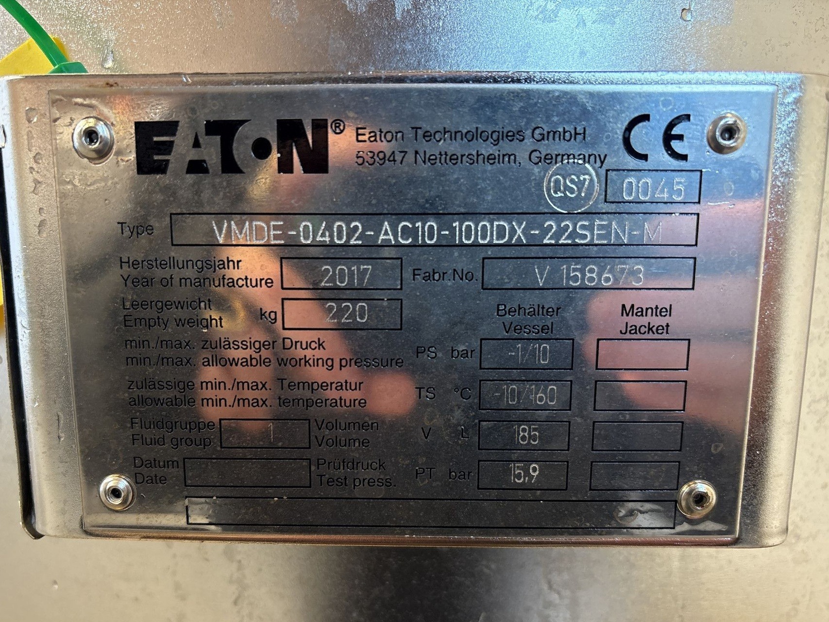 General SKU397X1153 MakeEaton LocationBarneveld CEcheck TypeVMDE-0402-AC10-100DX-22SEN-M Pressure Working pressure10 Bar Vacuum possiblecheck Main Features MaterialStainless steel Volume85 Ltr. Surface0.16 m2 Specified Features - Candle filter Candle filtercheck Filter surface± 0,4 m² (1,6 m ²) ...