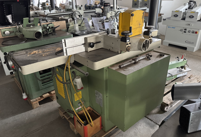 spindle tilting: yes 0 - 45°; height adjustment: manual; tilting adjustment: manual; fence adjustment: manual; read out height : -; read out tilting: Scala; read out fence: Scala; sawblade diameter: 30 mm; speeds: 3000, 4500, 6000, 9000; motor power: 5 kW; motor brake: yes, feed brake; suction connection: 2 x 100mm; machine length: 1200mm; machine depth: 1400mm; weight: 800kg; schwere Produktionsfräsmaschine