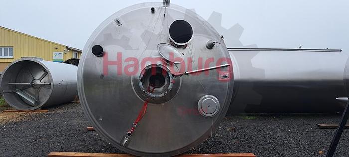 Double jacketed, isolated, process tank, previously used in a dairy factory as cream tank. Pressure in the jacket 3,5 bar. Pressure in the tank: ATM. Central placed propellor agitator with 2x big blades (diameter 1.280 - 1.600 mm) for gentle treatment of the product (cream). Motor agitator: 2,6/4,4 kW. Aearator on top of the tank (ATM). Manhole on top of the tank. Porthole with light on top. CIP bowls for cleaning inside the tank. Temperature probe and level ruler with interior float. 3 Stainless steel legs. Outlet in the bottom, 450 mm height, with outlet valve (76 mm connection). Cylindrical height: 3.100 mm. Total dimensions: Ø 3.100 x 5.800 mm. Tank already dismantled out of the factory and located in an outside warehouse in France., Type of Machine: Process tank, Volume: 20.000 liter, Double jacketed: Yes, Insulation: Bottom, Type of agitator: Central placed propellor agitator with 2x big blades, Motor of agitator: 2,6/4,4 kW, CIP Spray bowls: Yes, Manhole: Yes, Number of feet: 3, Internal diameter: 2.850 mm, Internal height: 3.100 mm, Total outside diameter: Ø 3.100 mm, Total outside height: 5.800 mm, Weight: ± 4.000 kg