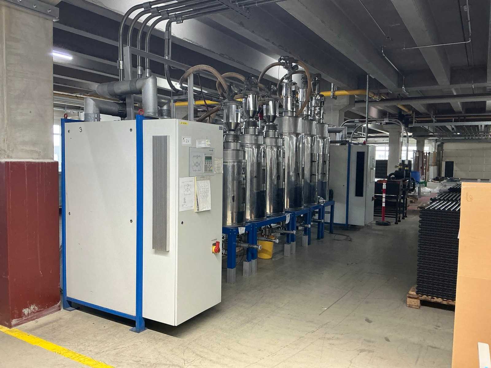 System consisting of 2x COLORTRONIC CTT 300 dry air dryer (built in 1998/2000), 1x COLORTRONIC TT 100 granulate silo, 2x COLORTRONIC TT200 granulate silo, 3x COLORTRONIC TT400 granulate silo, 2x BUSCH Mink MM1252AV vacuum pumps Auction-ID: A7-45263-21