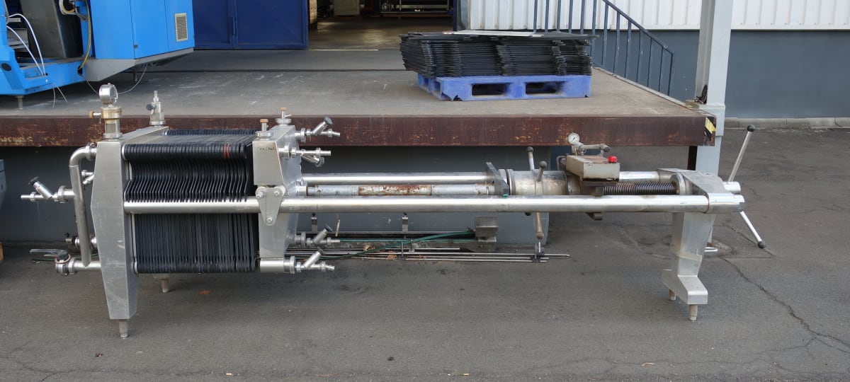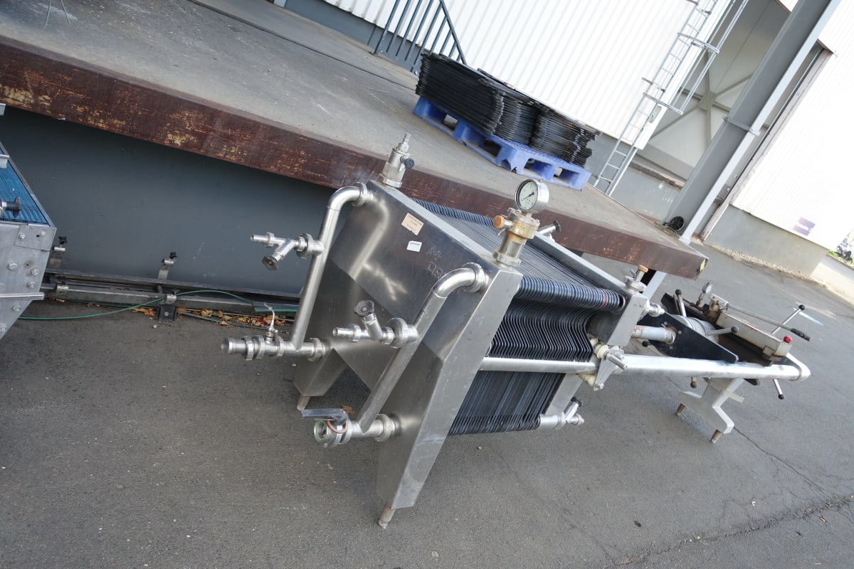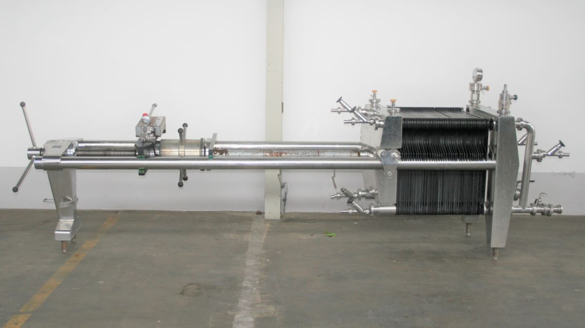 with manual hydraulics and 79x plastic filter plates 1x VA starter plate 1x VA end platePlates maximum: 150Plate formats: 600x600Platefilter features: Manual spindldimension ca. 380x100x140 cmDistance between first plate and spindle approx ca. 200cmMore then 300 machines new and second hand on our seema .de