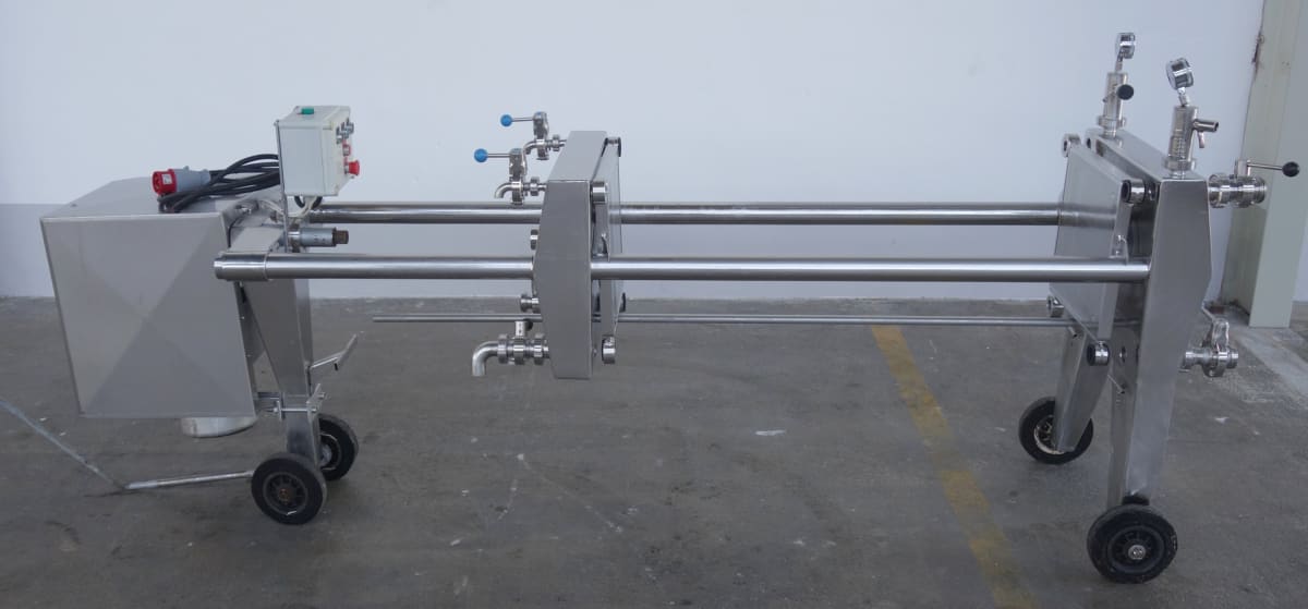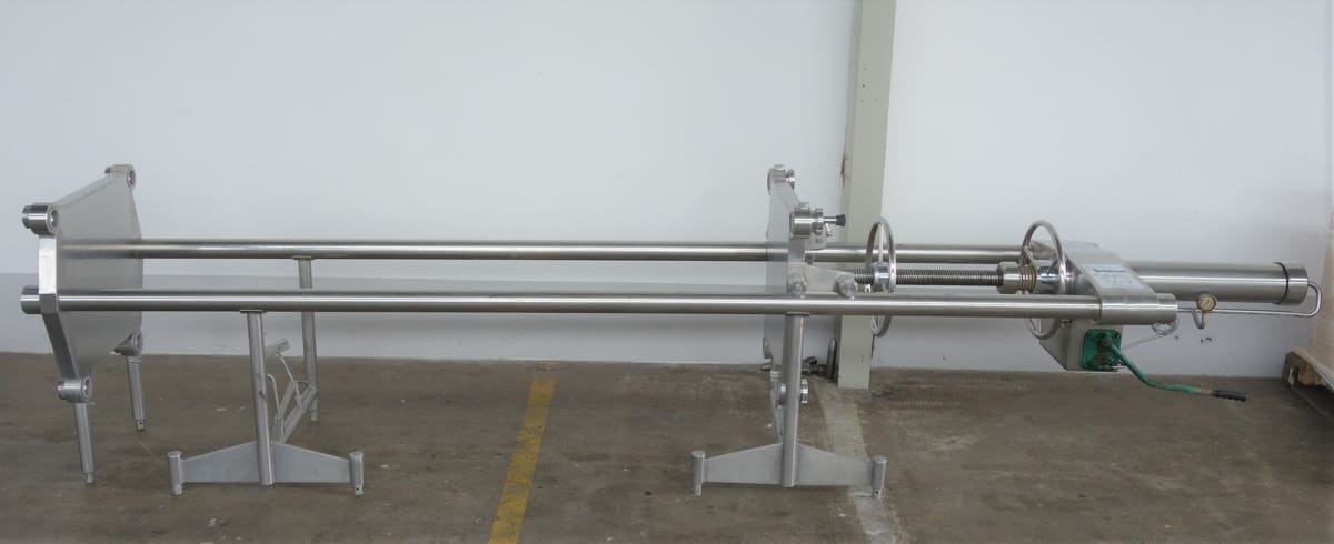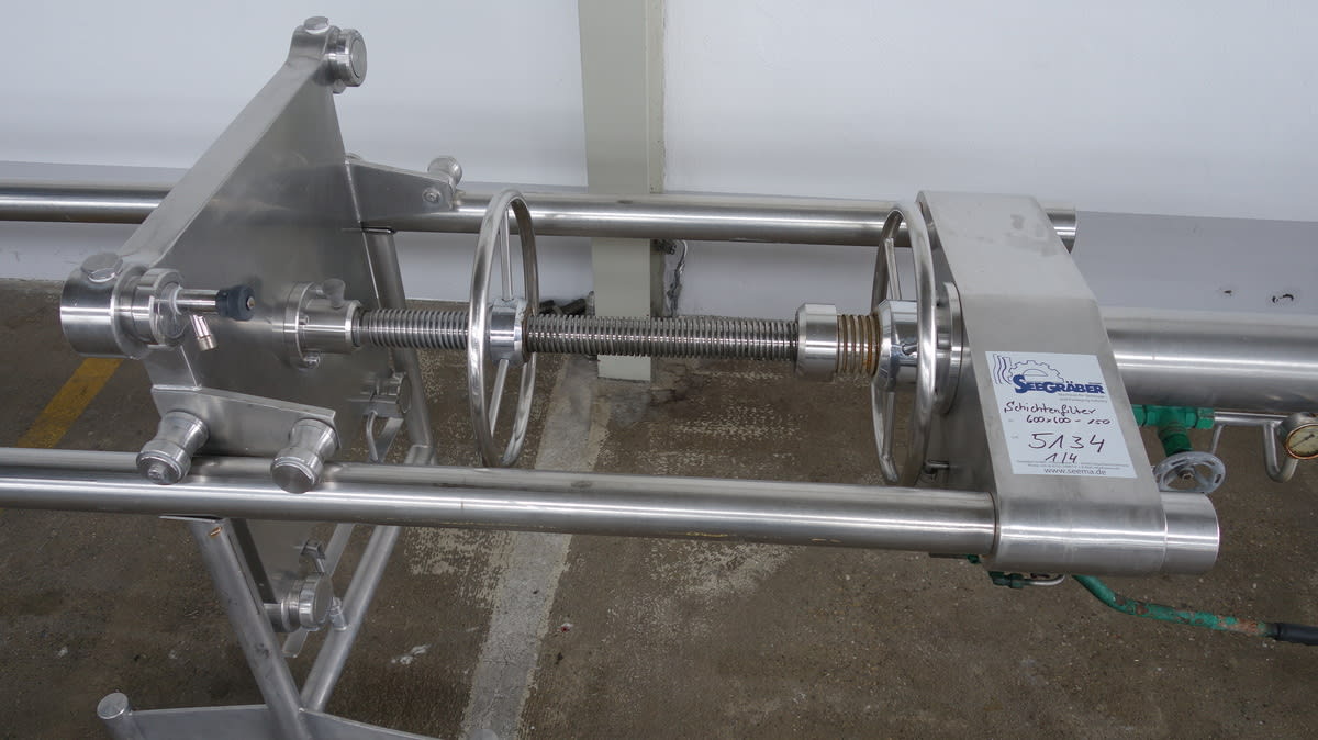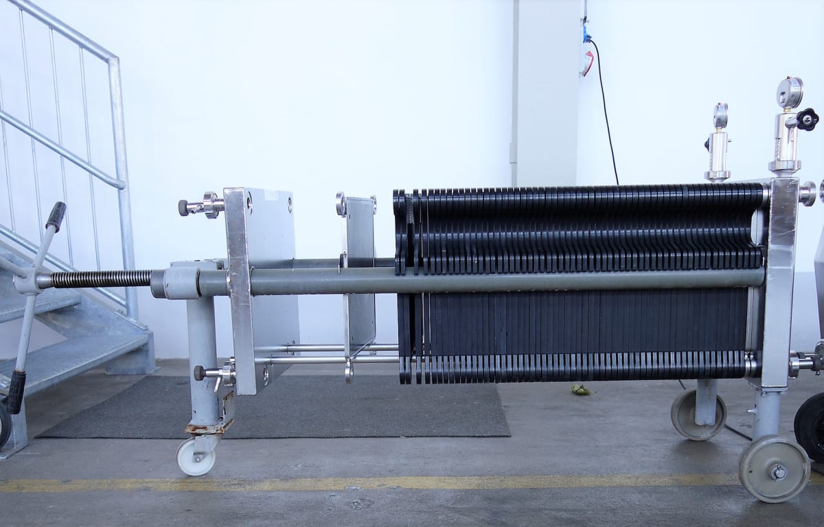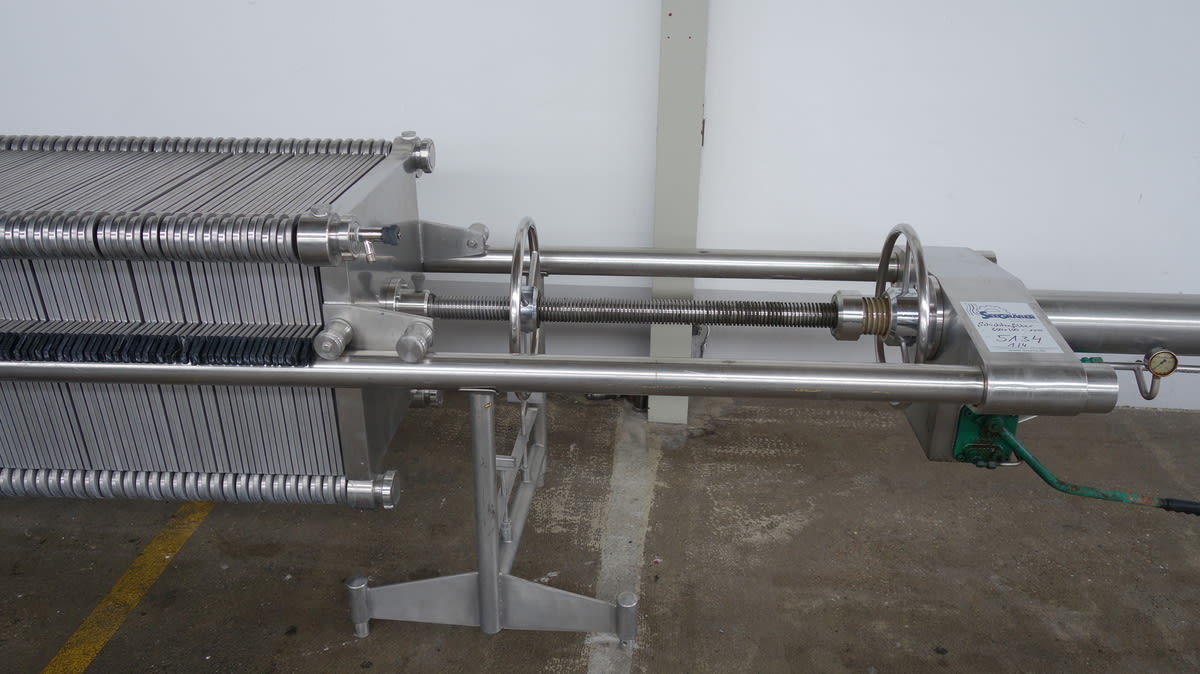 Housing for 101 plates.Delivery supply: with 2 end plates of stainless steel.Intermediate plates are not includedPlates maximum: 100Plate formats: 400x400Platefilter features: Manual spindlDimension  ca. 300x60x100 cmdimensio between the first plate to the spindle ca. 170cm          More then 300 machines new and second hand on our seema .de