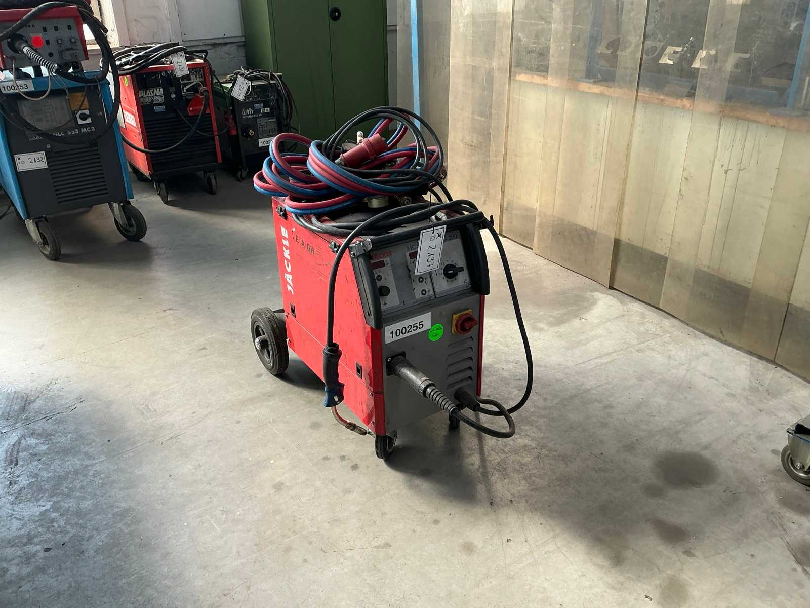 250 amp MIG welding rectifier with leads and gun, S/No 17340921, with 2 welding helmets, ANR 2452 Auction-ID: A1-45187-223