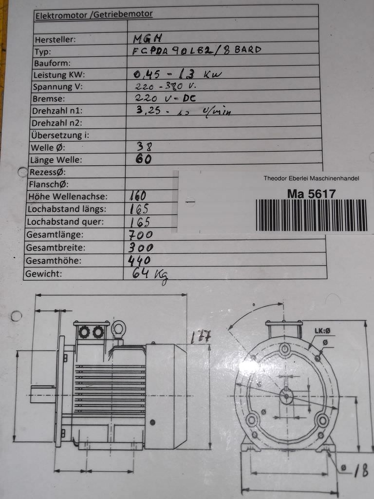 Tipo de máquina: Gear motor 0.45/1.3 kW 3.25/15 rpm