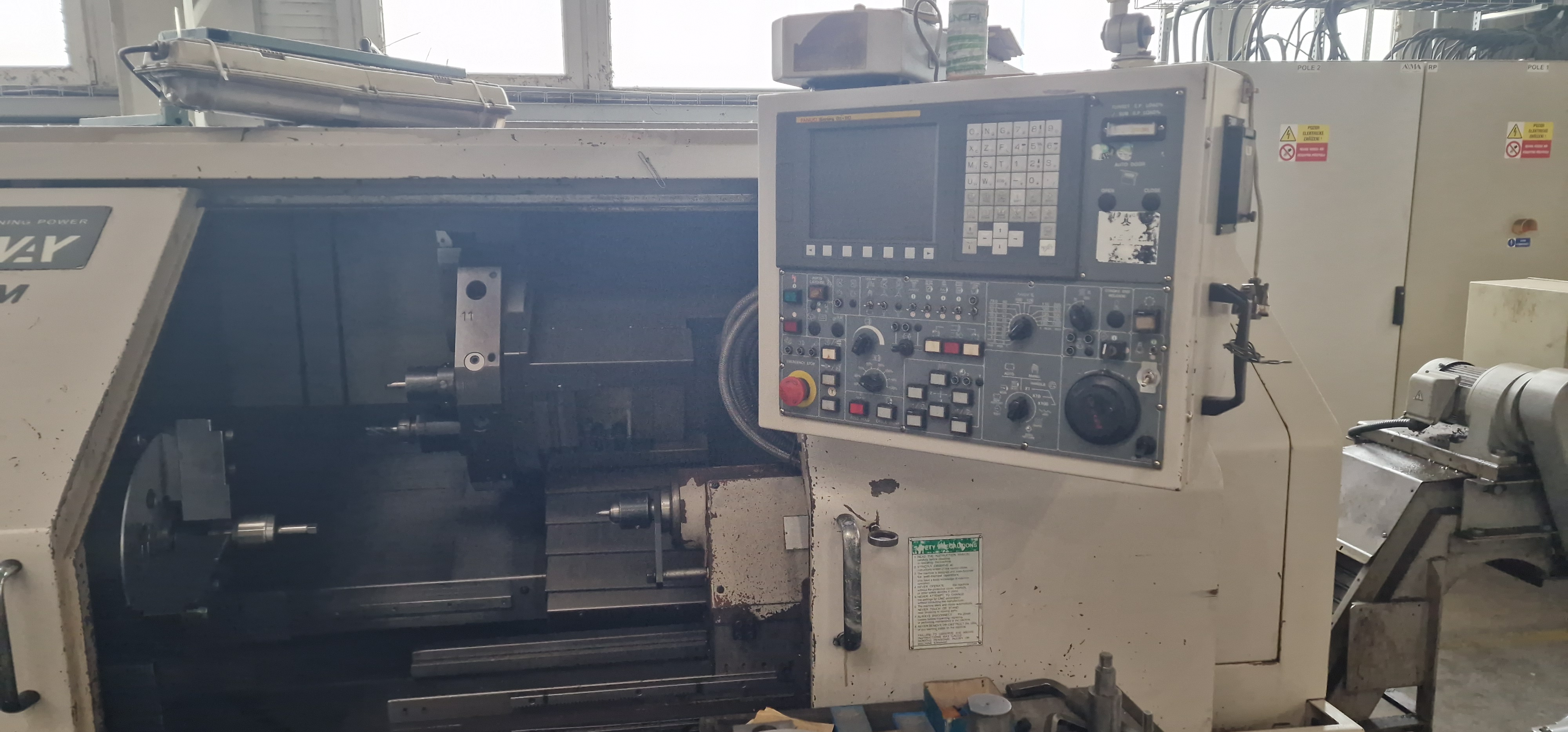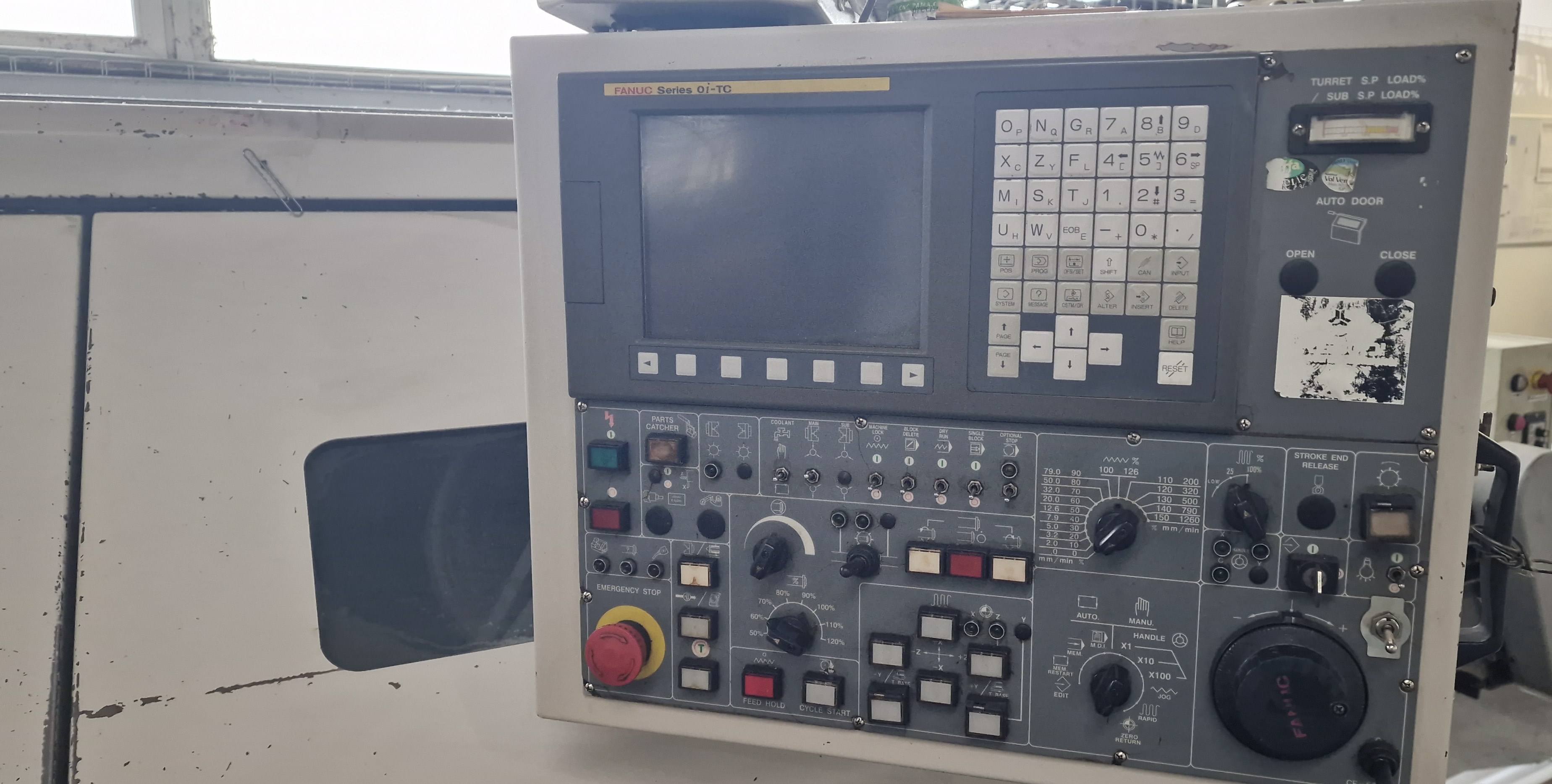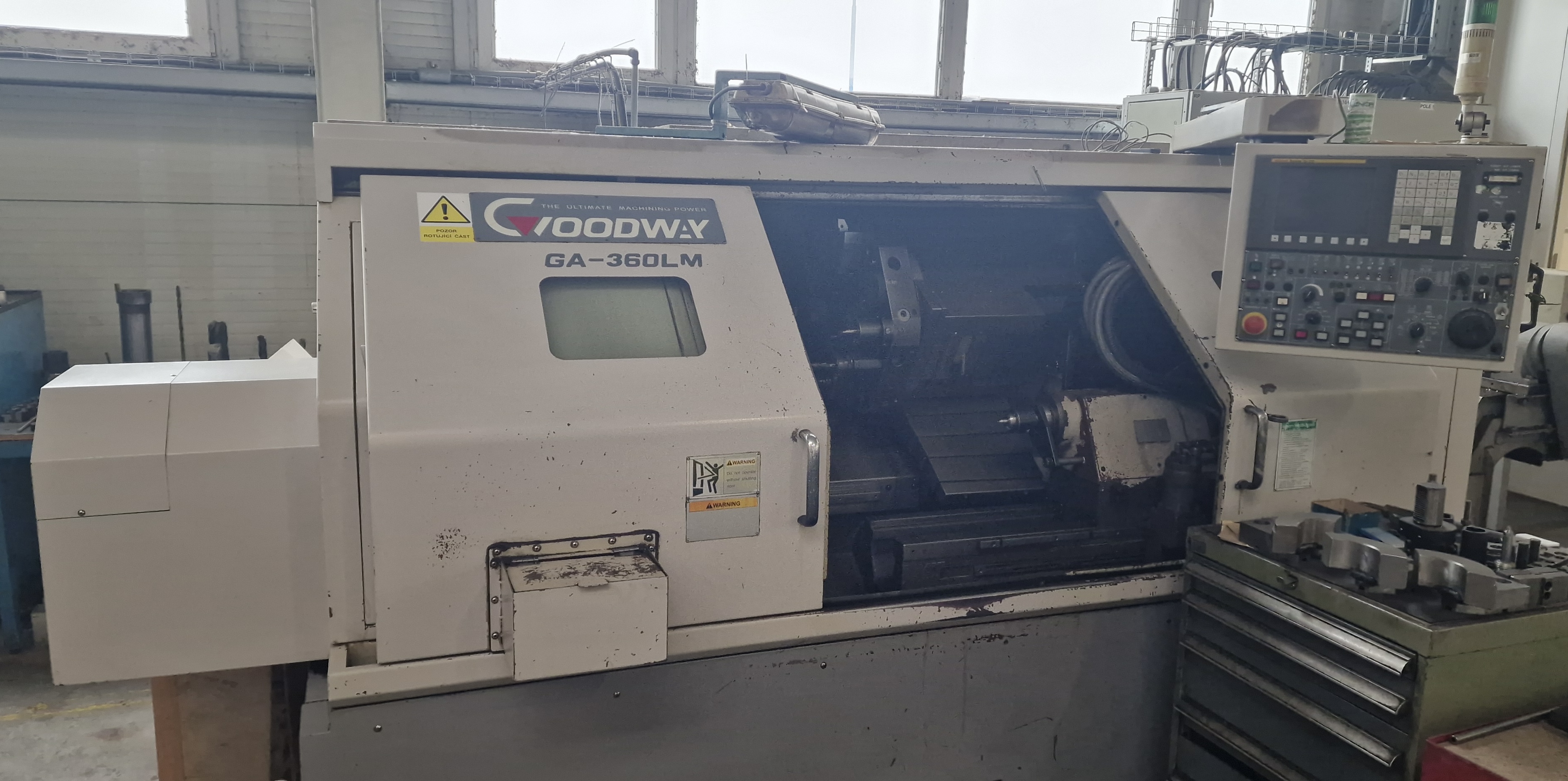 CNC lathe Type: GA-360 LM Manufacturer: Goodway Year: 2005 Control: Fanuc Series Oi-TC Max turning diameter: 500 mm Max turning length: 1200 mm Clamping head: 100 mm Swing over bed: 700 mm Spindle bore: 75-105 mm Chuck size: 15" LM driven tools with milling function (C-axis) Driven tool motor: 7 hp Spindle motor: 30 hp Revolver head: 12 VDI 3-jaw chuck Chip conveyor Tailstock Machine in good condition, under power Find more here - / Contact us at -