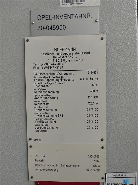Total force (nominal):800 toClamping surface (left-right):x mmClamping surface (front-back):x mmtable surface area:3200 X 2200 mmTotal force (nominal):2-3-4-5- Presse - 600 to. totable surface area:2-3-4-5- Presse 3100 X1900 mmLast overhaul 2010/2020, consisting of:Circuit board washing system, manufacturer Neuhäuser, with 6 cleaning rollers, system no. 0905200, control unit by SiemensBlank automation, manufacturer Neuhäuser, type 19711594-00-0, year 2002, SN 369507/002, system no. FK42282, consisting of: destacking device, oiler, pallet changer, empty pallet dischargeGripper automation, manufacturer Olofström, type Doppin Loader 2000, SN 37719974886, system no. 0602300Double-column press, manufacturer Weingarten, type ZS 1200.34Year 1972, order no. 113 021, pressing force approx. 800 t, double action, stroke 850 mm, stroke adjustment 350 mm, height between table surface and drawing  ...