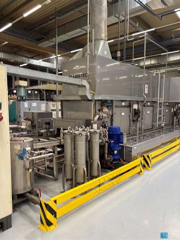 1 Markert Cleantec continuous surface cleaning machine, year of manufacture: 2003 Continuous length approx. 7,000 mm with division into washing zones, rinsing zone, and blow-off system with associated transport system with 2 x 90° curved elements with chain drive with electric control for transporting wire mesh baskets, primarily 400 x 600 mm with associated control cabinet for controlling the timed material flow Machine no.: 932