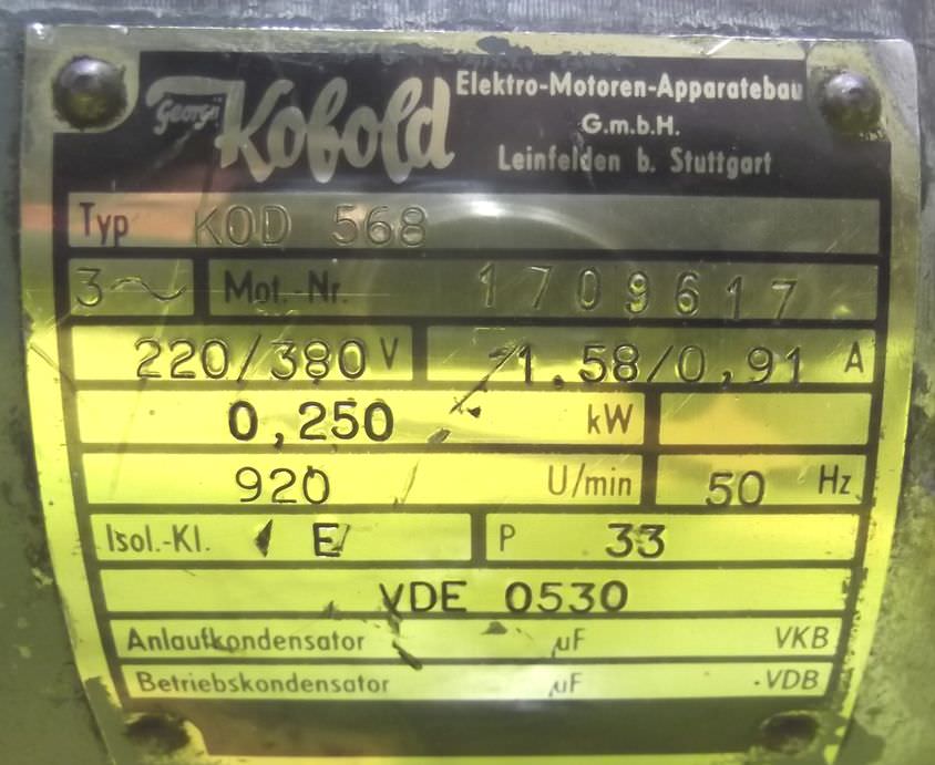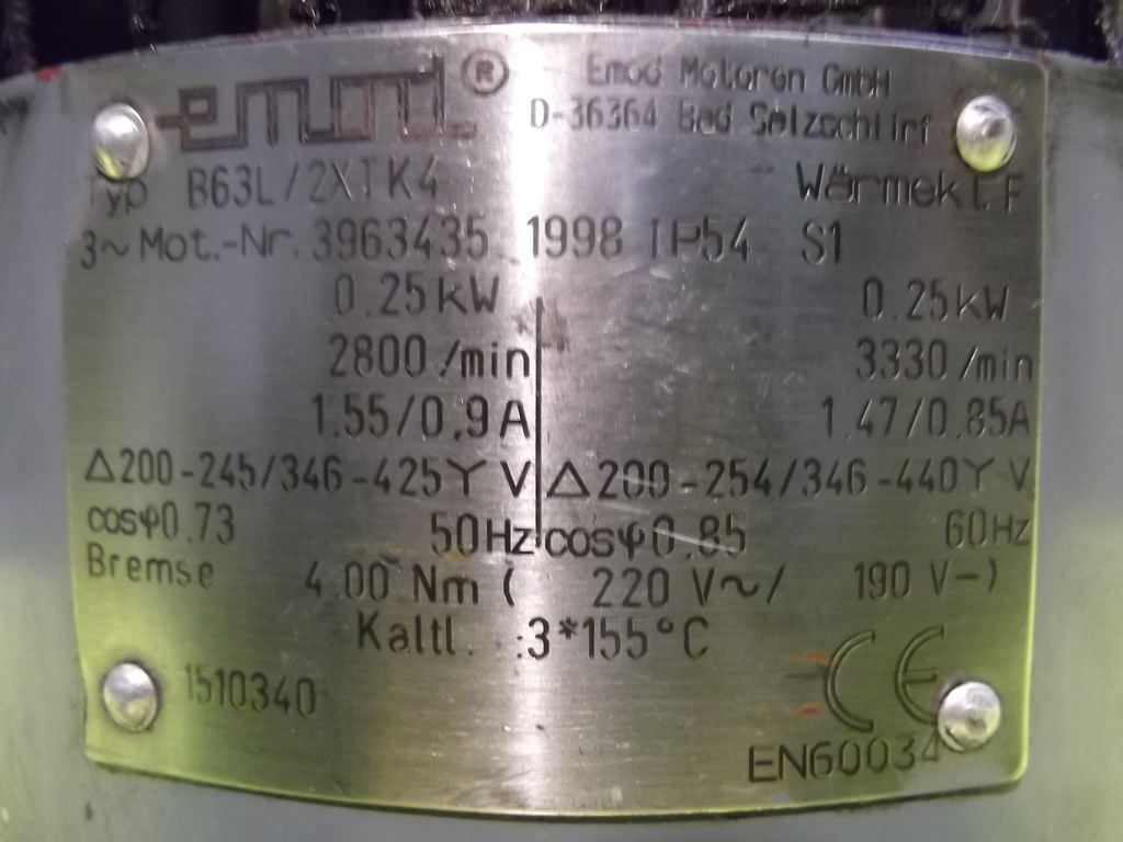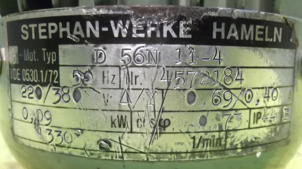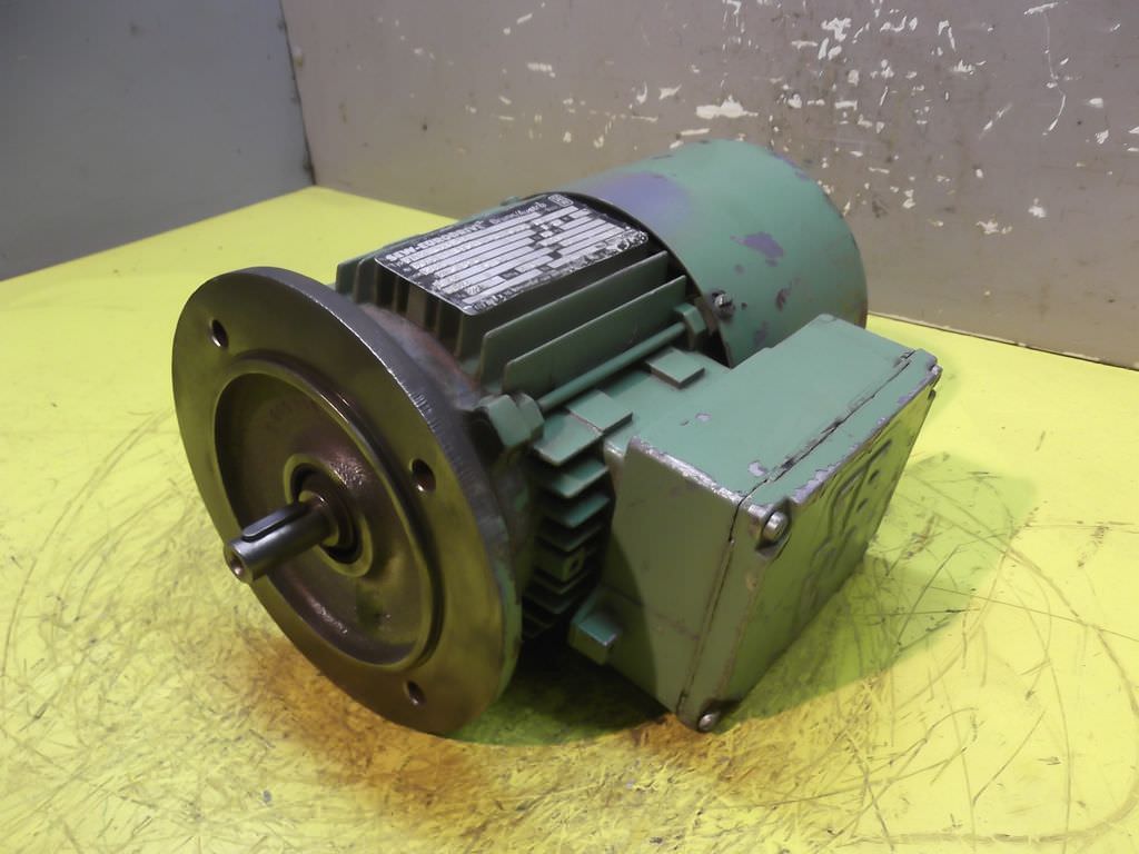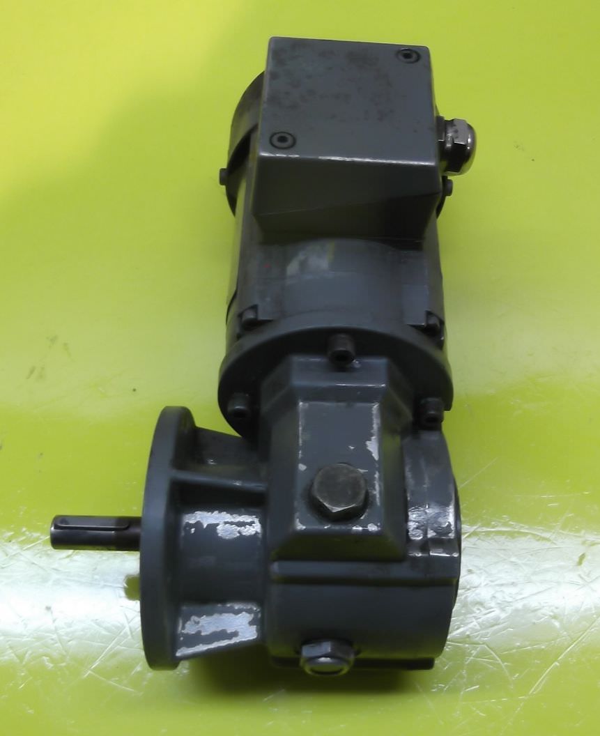 Three-phase synchronous motor, gear motor, electric motor -Three-phase synchronous motor: Baumuller type DSOG 71-S -Gearbox: SEW-Eurodrive type KA46 LP90 -Speed: 3000 rpm -Power: 6.8 kW -Brake -external fan -Construction: hollow shaft -Diameter shaft: O 35 mm -Brake -Protection class: IP 54 -Weight: 50 kg -Number: 4x engines available -Price per piece