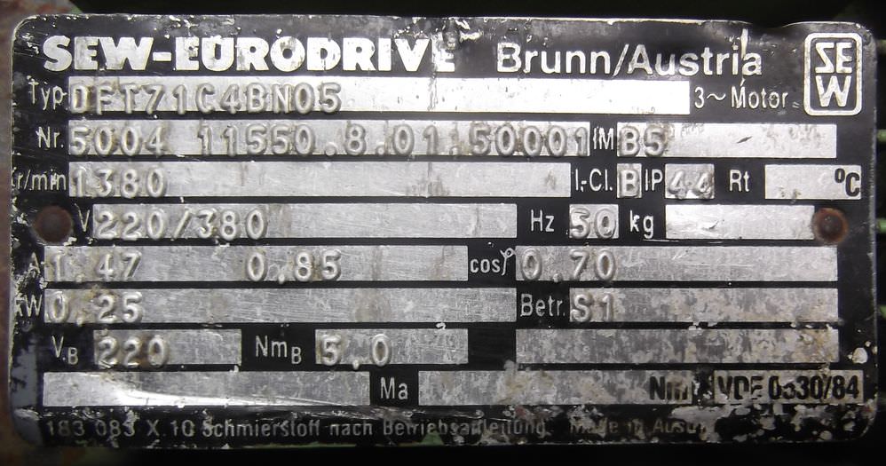 Geared motor, electric motor, three-phase motor, electric geared motor -Speed: 31 rpm -Power: 0.37 kW -1x Type: FZOD044S -3x Type: FZOD71N13-4 -Design: B14 -Shaft diameter: 25 mm -Protection class: IP 33 -Number: 2x gear motor available -Price: per piece -Dimensions: 380/170/H120 mm -Weight: 15 kg