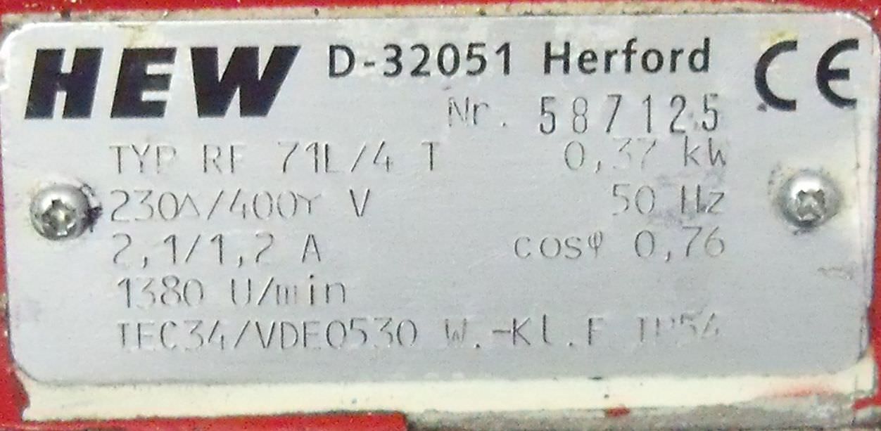 Gear motor, electric motor -Speed: approx. 98 rpm -Power: 0.37 kW -Construction: B5 angle -Diameter hollow shaft: Ø 15 mm -Protection class: IP 54 -Weight: 10 kg