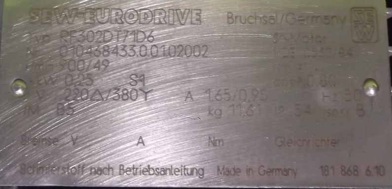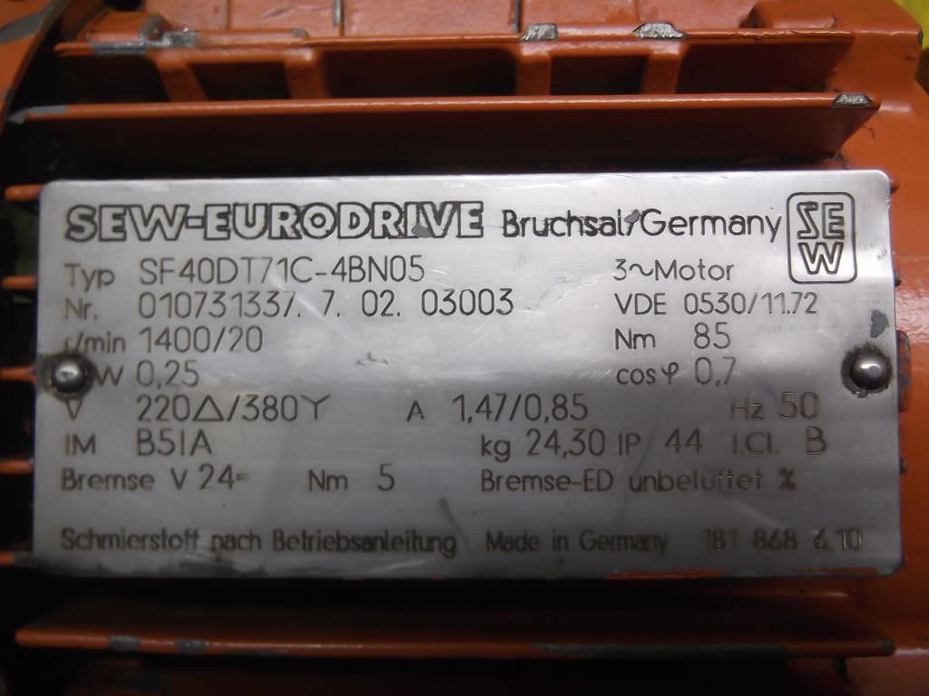 Gear motor, electric motor -Speed: 36.5 rpm -Power: 0.75 kW -Construction: B5 -Shaft diameter: Ø 30 mm -Brake: 24 V -Protection class: IP 65 -Weight: 36 kg