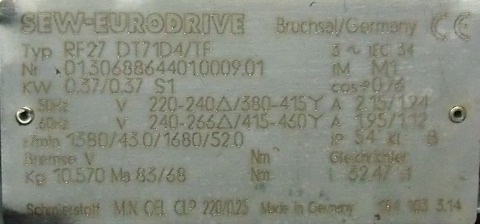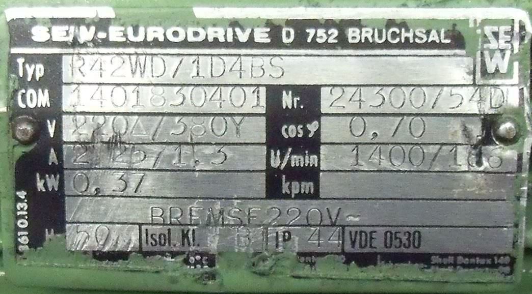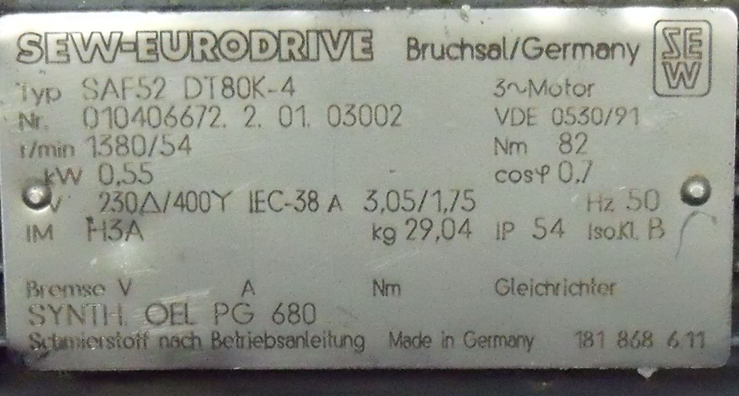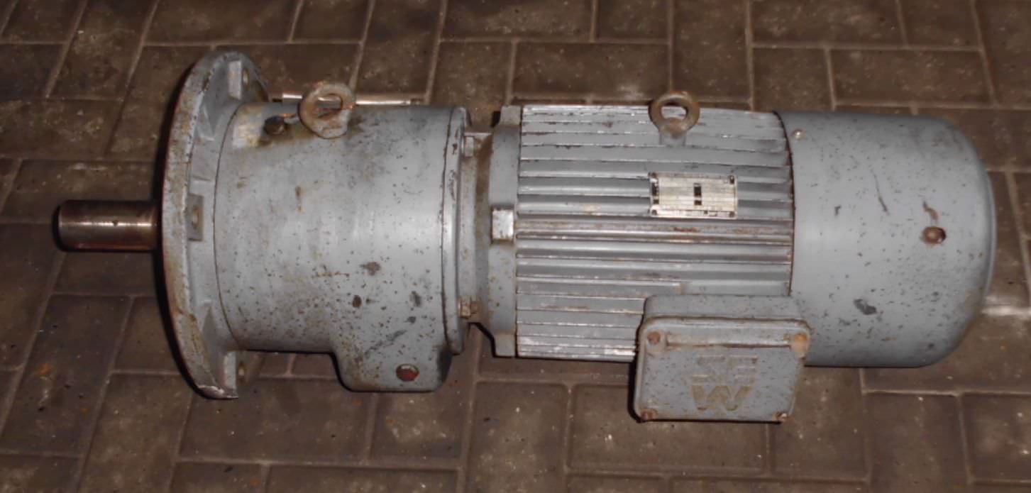 Gear motor, electric motor -Speed: 98 rpm -Power: 0.37 kW -Construction: B5 angle -Diameter hollow shaft: Ø 15 mm -Protection class: IP 55 -Weight: 10 kg