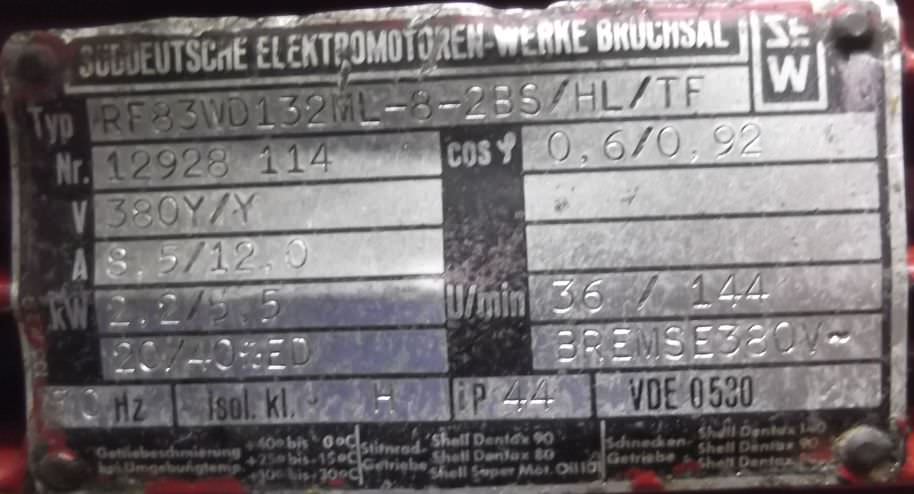 Gear motor, electric motor, three-phase motor -Speed: 36/144 rpm -Power: 2.2/5.5 kw -Type: RF83WD132ML-8-2BS/HL/TF -Brake -Construction: B5 -Diameter shaft: Ø 50 mm -Protection class: IP 33 -Number: 2x motors available -Price: per piece -Dimensions: -Weight: 160 kg