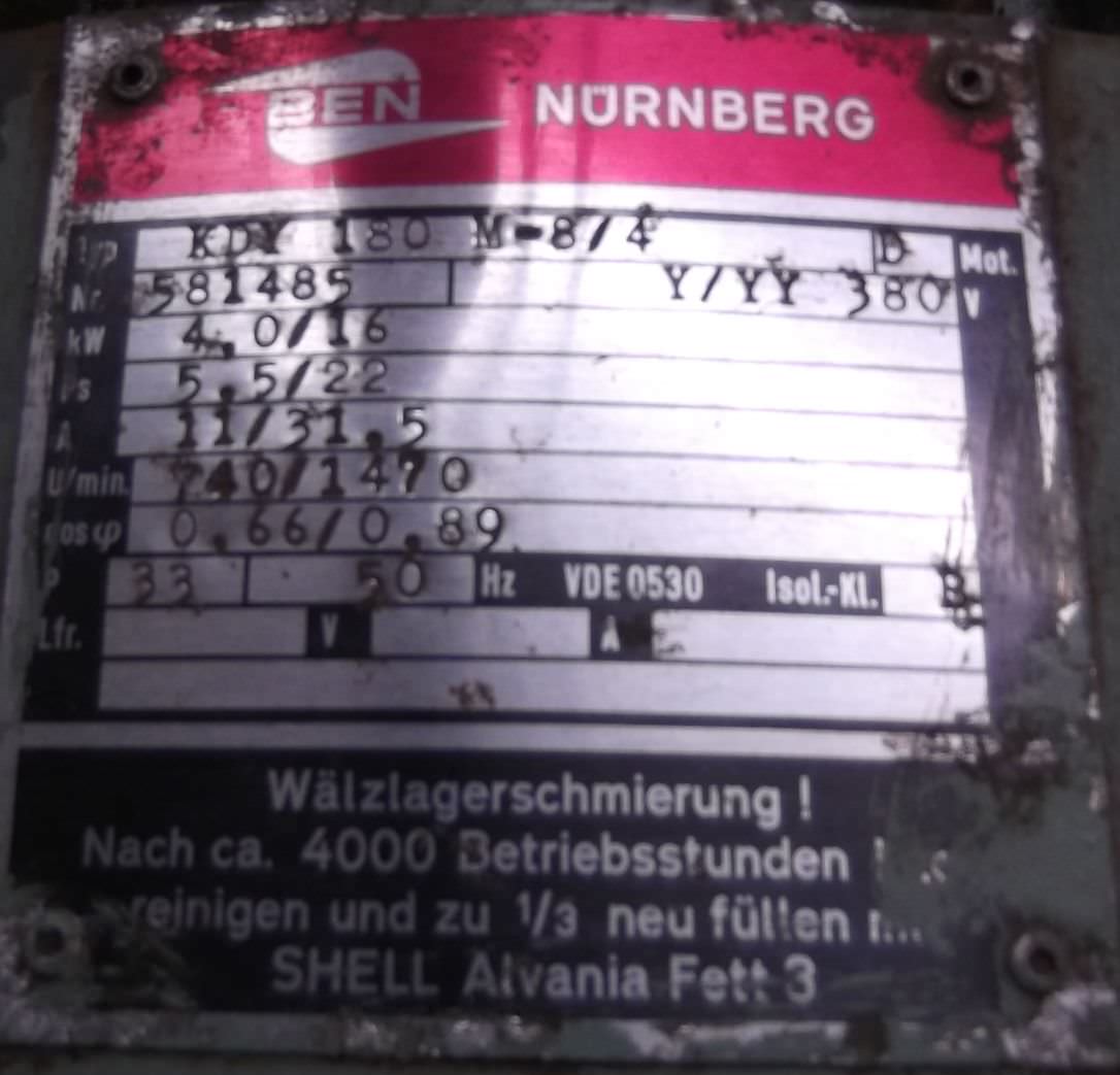 Electric motor, three-phase motor-Power: 5/7 kW-Speed: 735/1470 rpm-Shaft: Ø 42 mm-Construction: B3-Protection class: IP 54 EX-Brake: with temperature sensor-Dimensions: 920/400/H330 mm-Weight: 175 kg