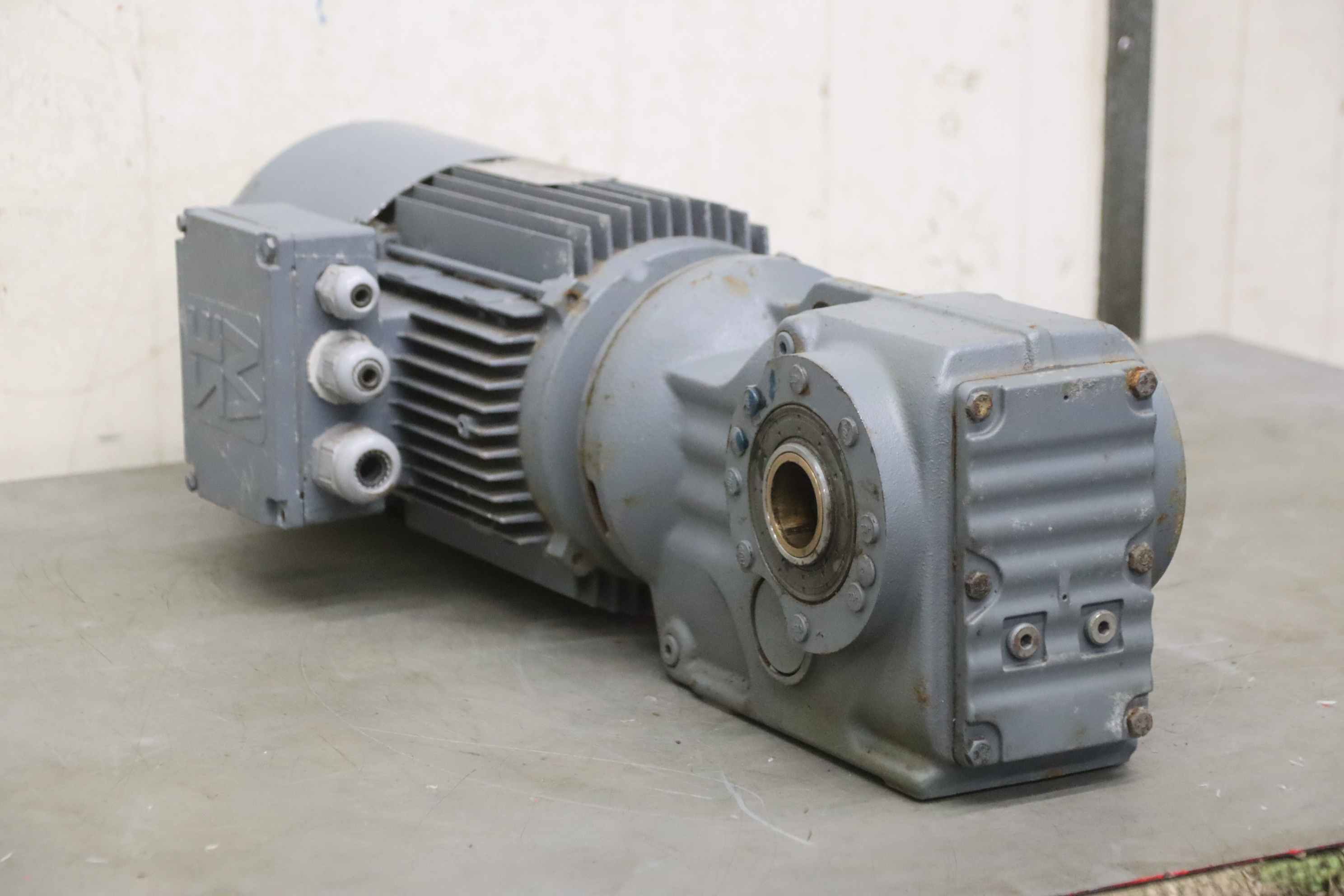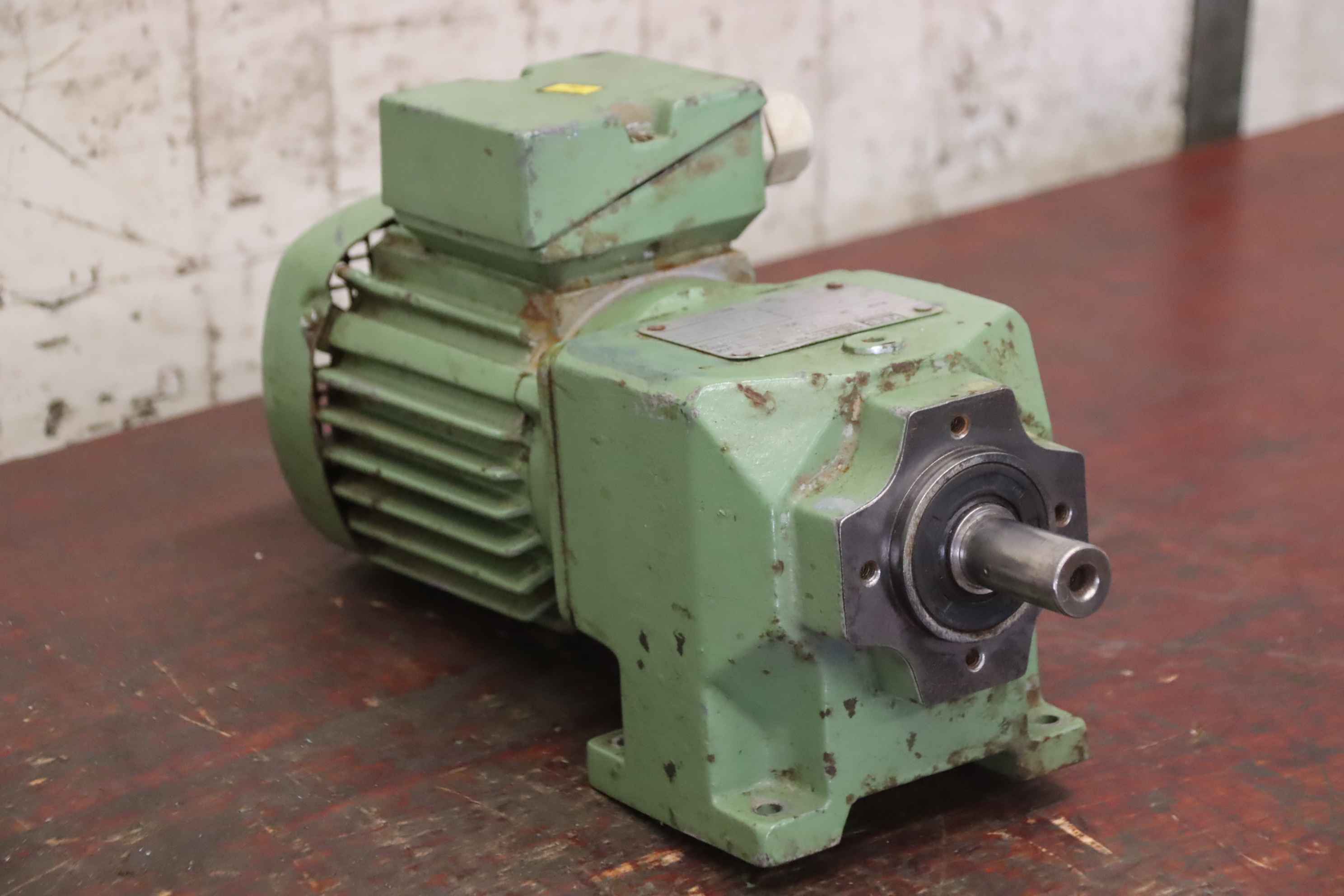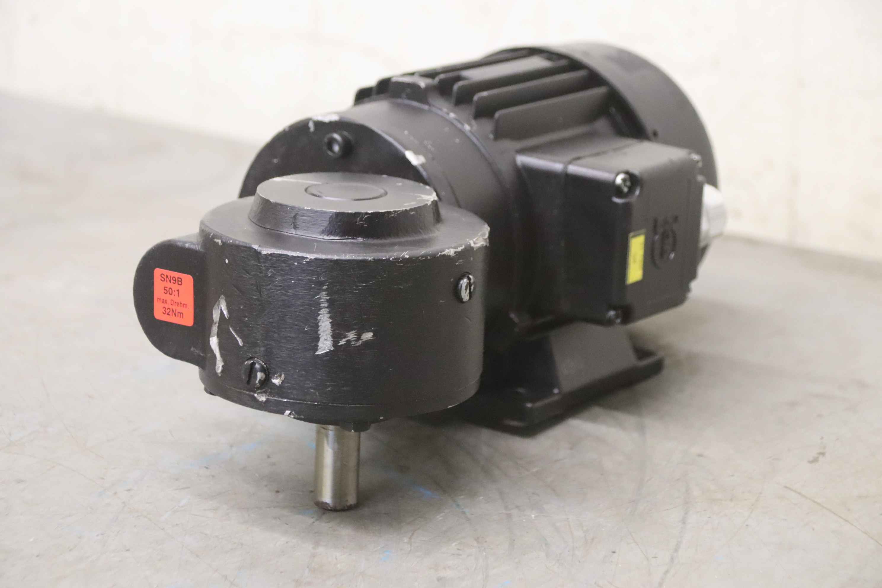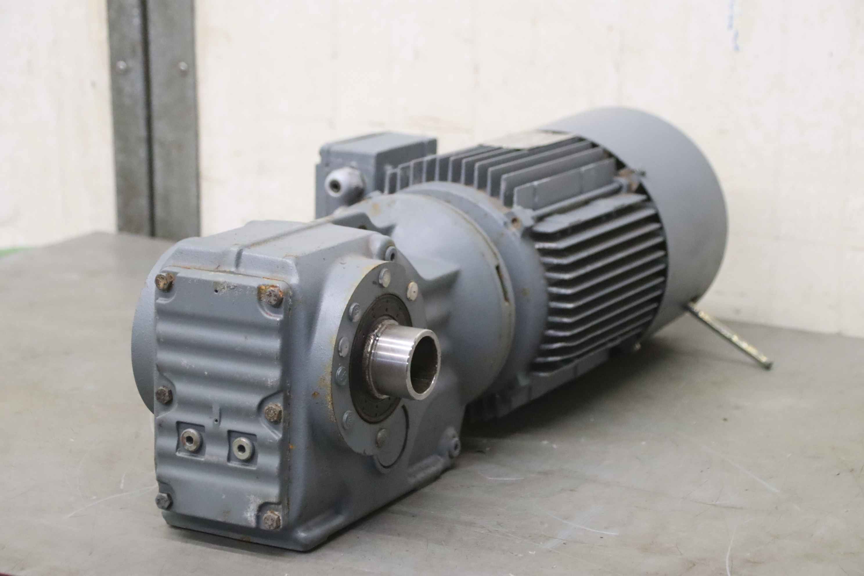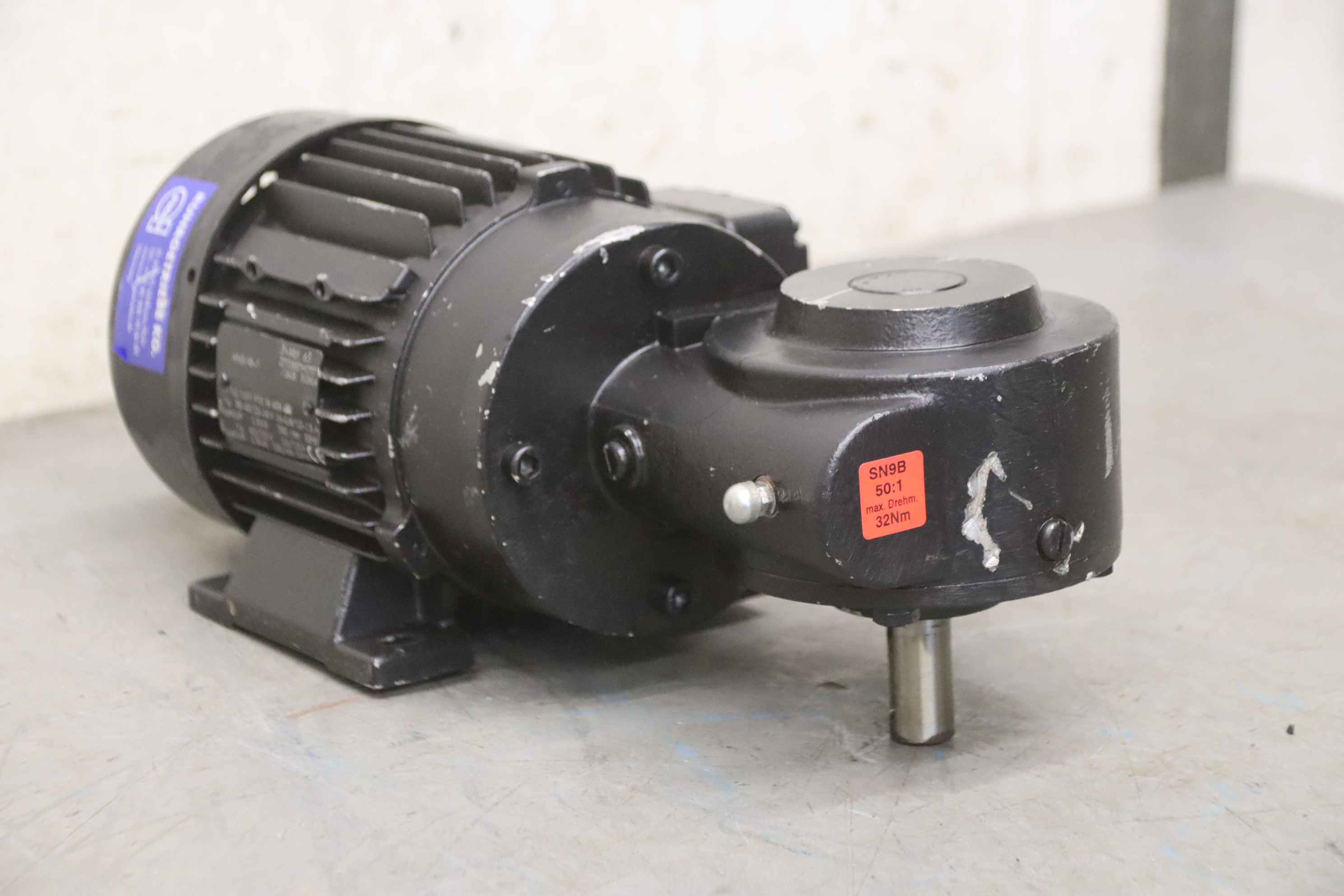 Geared motor, electric motor, electric geared motor, angular geared motor, automatic band saw-Manufacturer: Ruhr gearbox, angular gear motor-Type: SN9B i= 50:1-Speed speed: approx. 28 rpm-Motor: Type AF63/4B-7 1380 rpm-Shaft: Ø 16 x 30 mm-Quantity: 1x geared motor available-Price per piece-Dimensions: 300/150/H120 mm-Weight: 6.4 kg/pc.