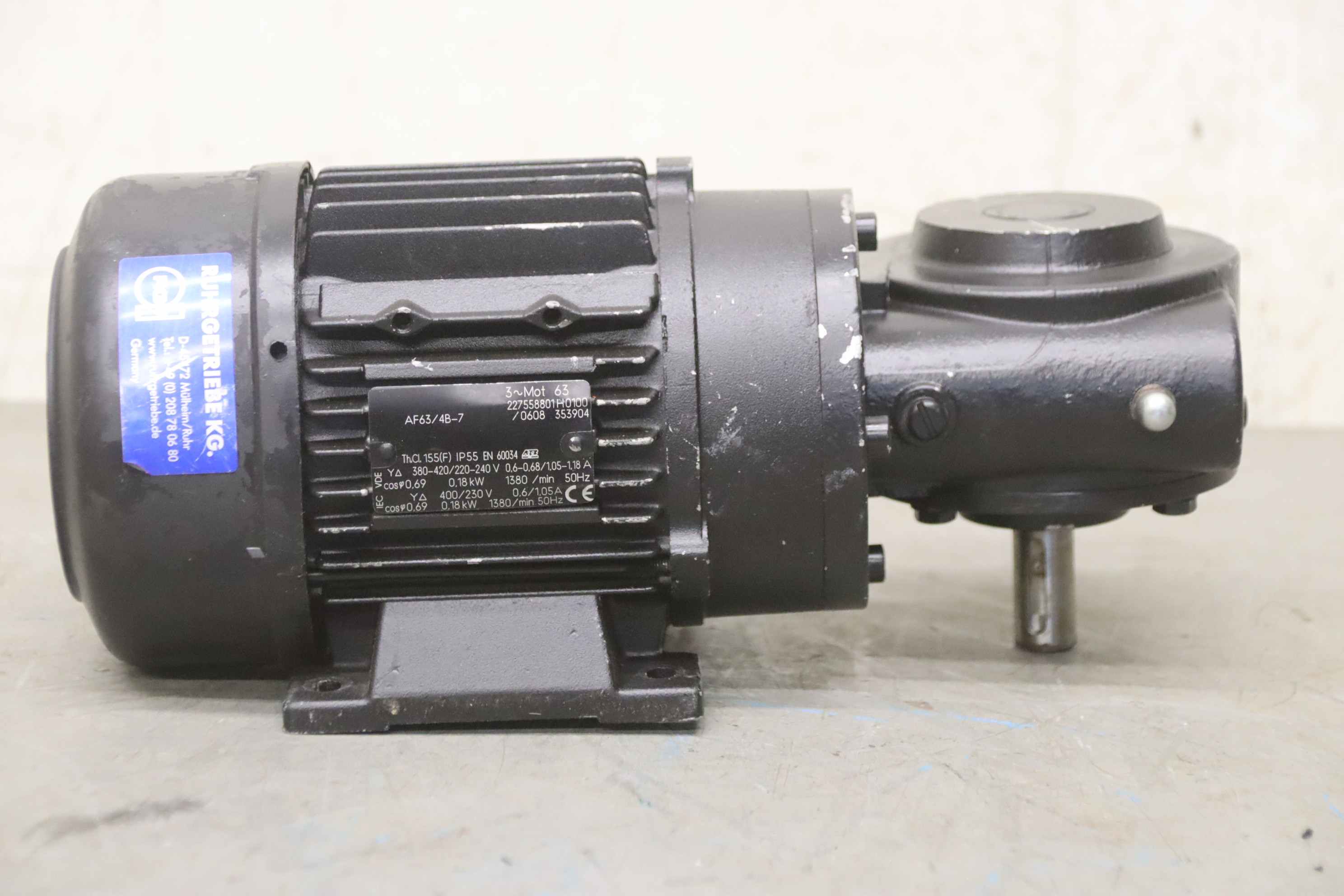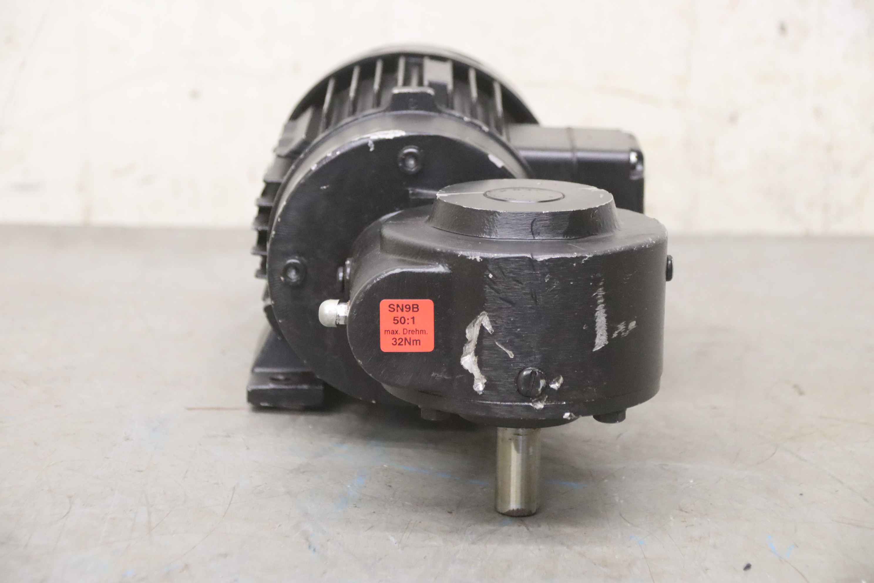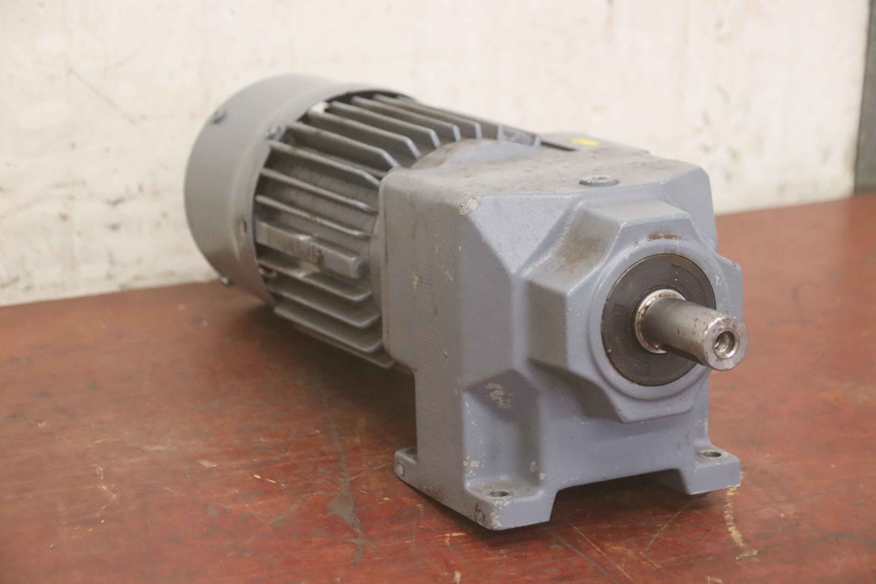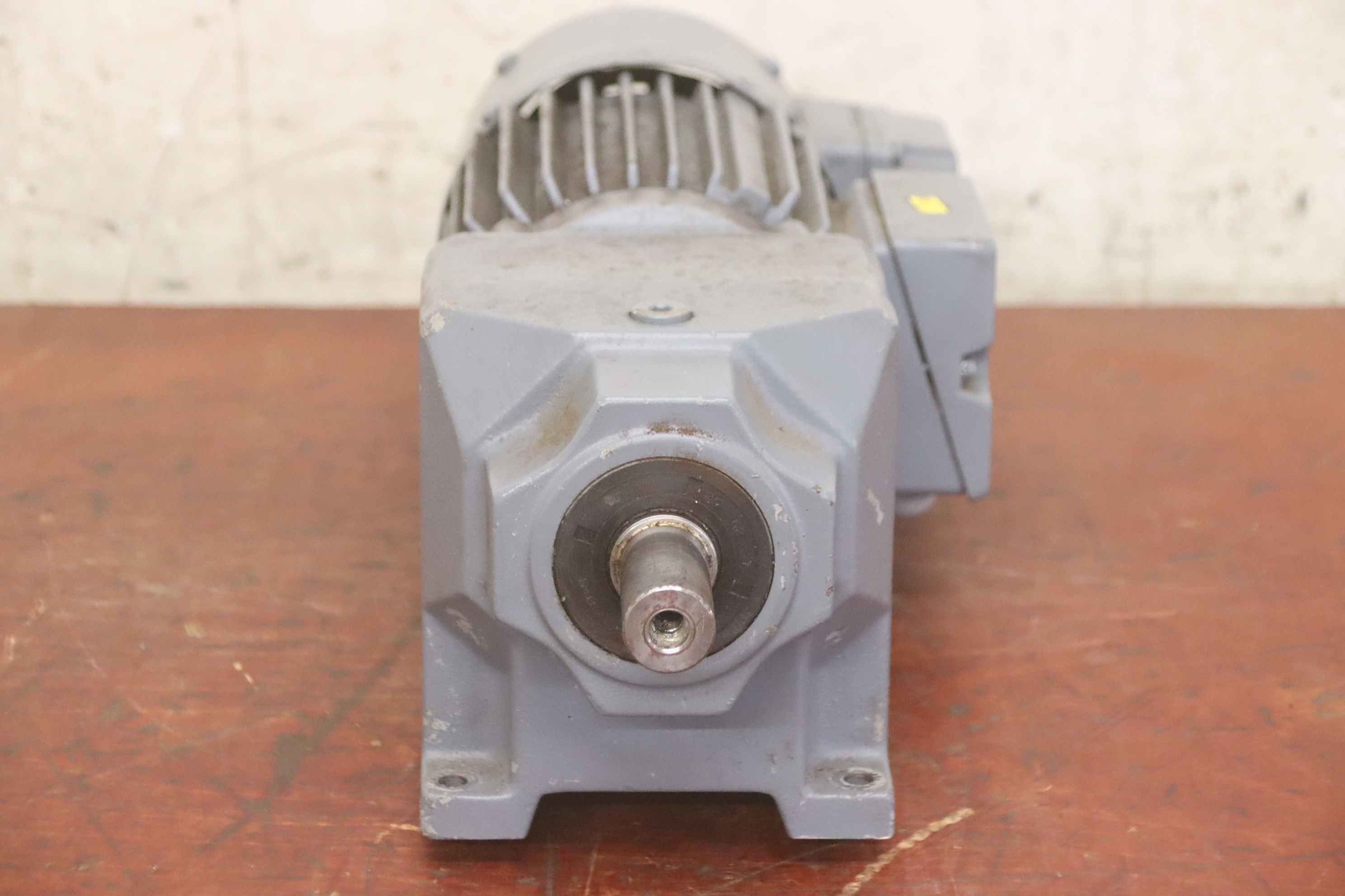 Geared motor, electric motor, electric geared motor, angular geared motor, automatic band saw-Manufacturer: Ruhr gearbox, angular gear motor-Type: SN9B i= 50:1-Speed speed: approx. 28 rpm-Motor: Type AF63/4B-7 1380 rpm-Shaft: Ø 16 x 30 mm-Quantity: 1x geared motor available-Price per piece-Dimensions: 300/150/H120 mm-Weight: 6.4 kg/pc.