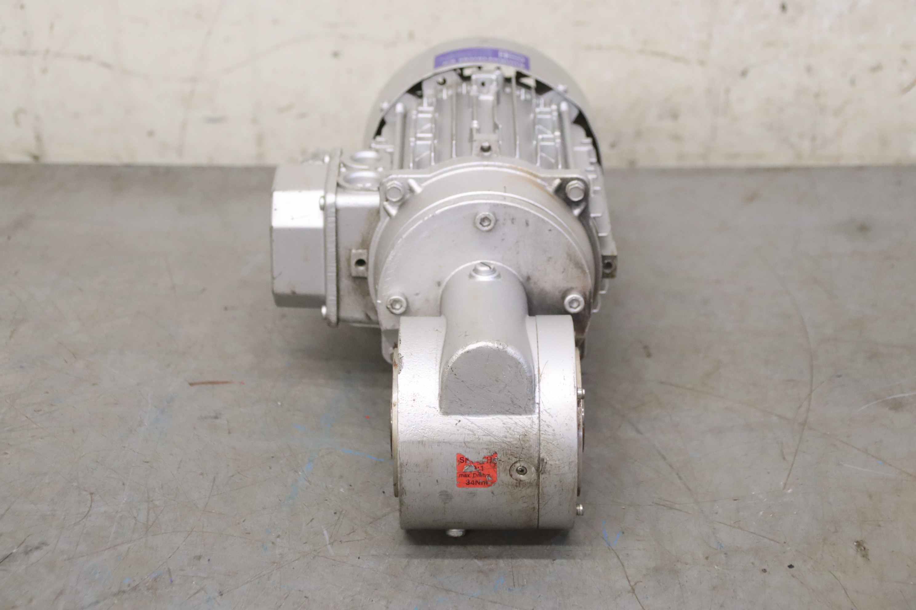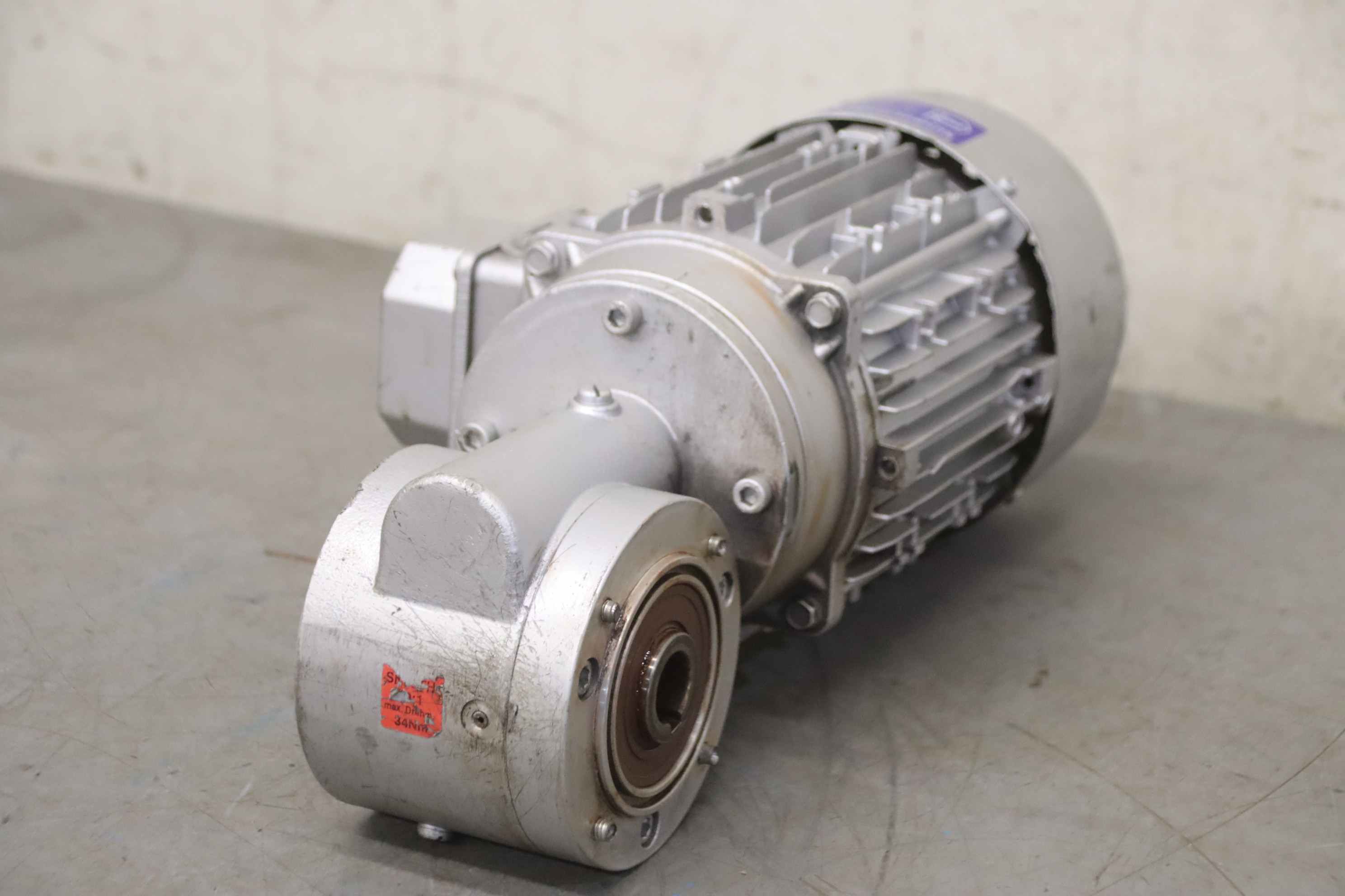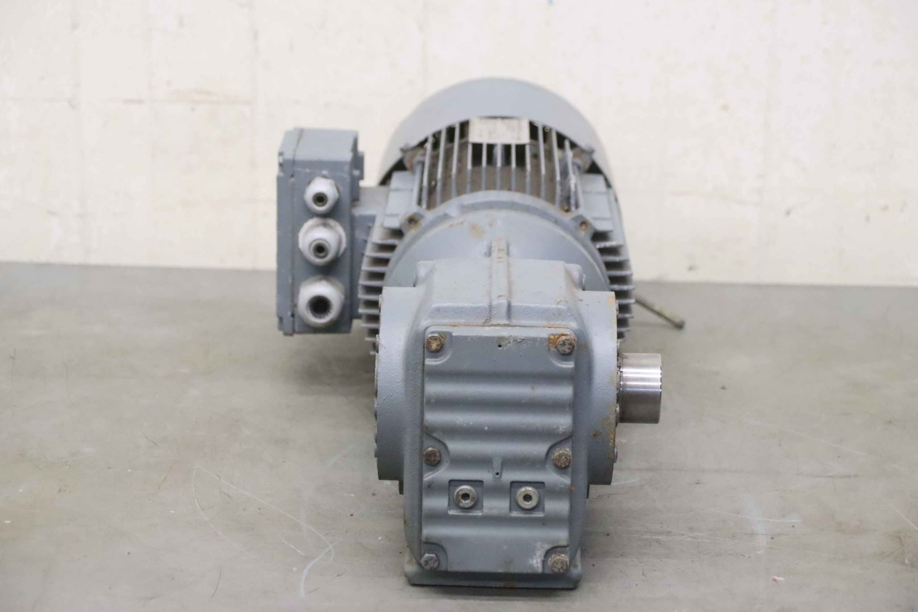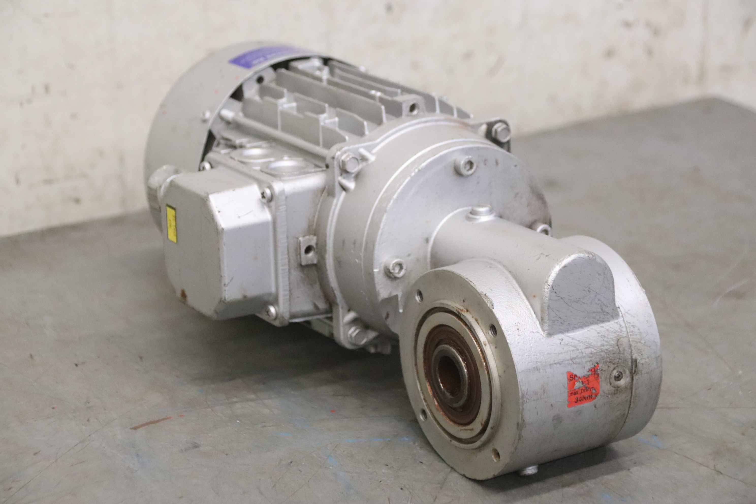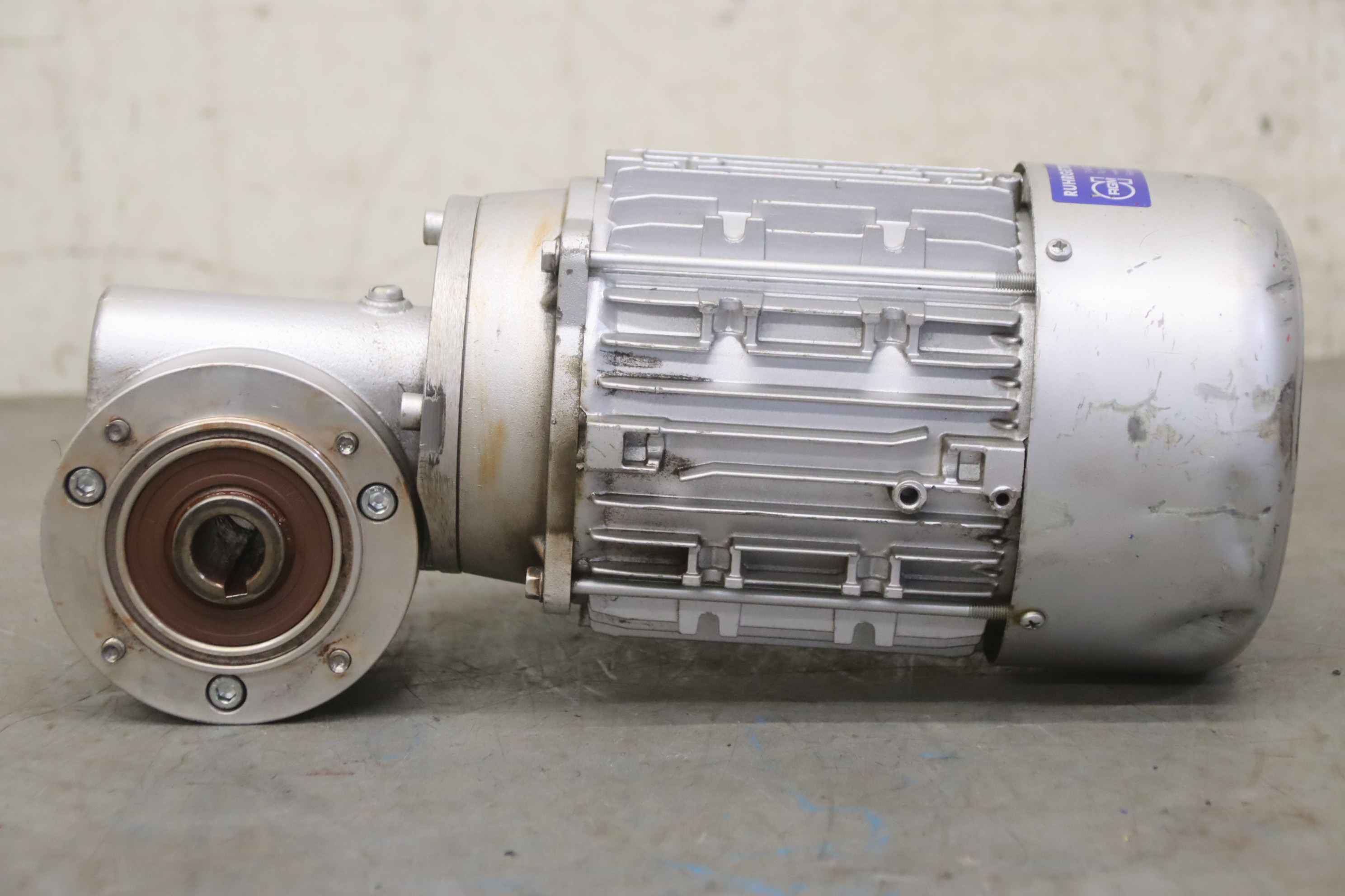 Geared motor, electric motor, electric geared motor, angular geared motor, automatic band saw-Manufacturer: Ruhr gearbox, angular gear motor-Type: SN9B i= 50:1-Speed speed: approx. 28 rpm-Motor: Type AF63/4B-7 1380 rpm-Shaft: Ø 16 x 30 mm-Quantity: 1x geared motor available-Price per piece-Dimensions: 300/150/H120 mm-Weight: 6.4 kg/pc.