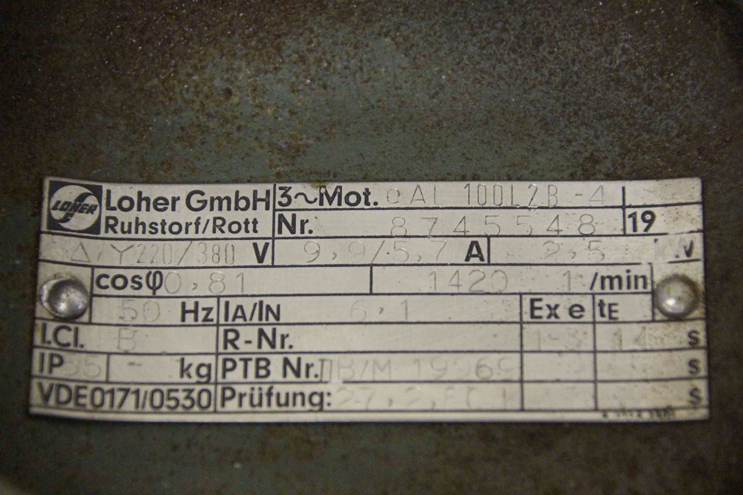 Three-phase motor, electric motor -Manufacturer: Loher, electric motor type eAL 100L2B-4 -Power: 2.5 kW -Speed: 1420 rpm -Shaft: Ø 28 x 60 mm -Hole circle: Ø215 mm -Recess Ø180 mm Flange: Ø 250 mm -Design: B5 -Protection rating: IP 55 -Dimensions: 380/250/H295 mm -Weight: 28kg