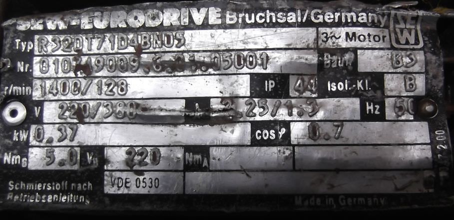 adjustable gear motor, variable speed gear motor, electric motor -Manufacturer gearbox: Stöber type RD11-1003 -Motor manufacturer: ABB Motors Type M2AA071A -Engine power: 0.37 kW -Speed range adjustable: 64-641 rpm -Shaft: Ø15 x 40 mm -Dimensions: 450/210/H180 mm -Weight: 15.7 kg