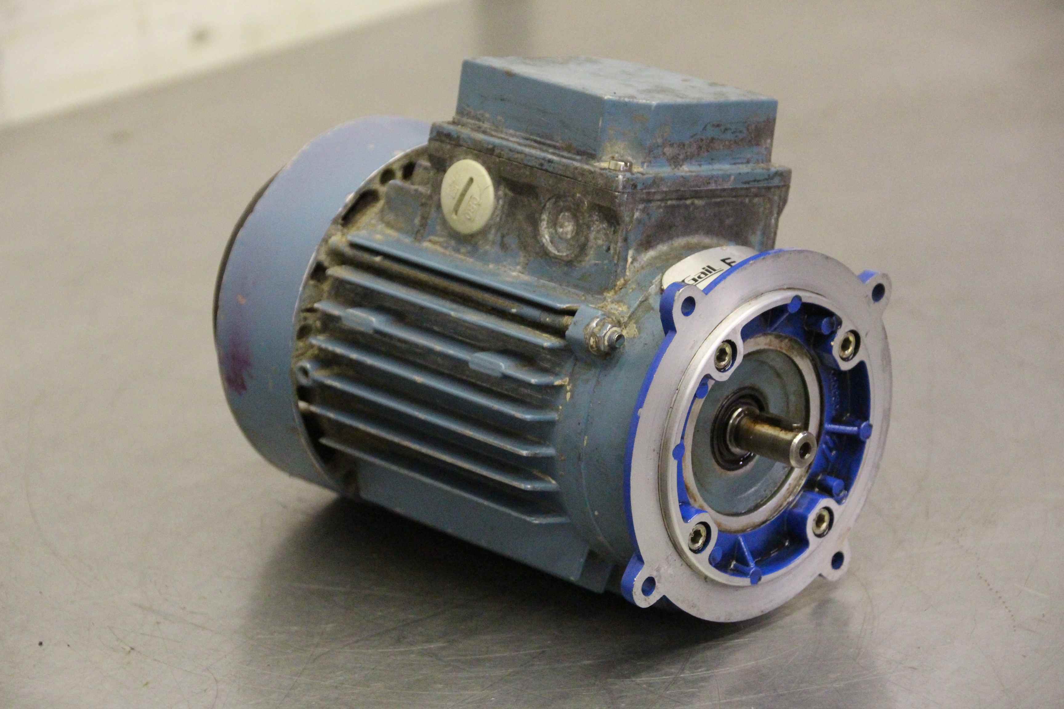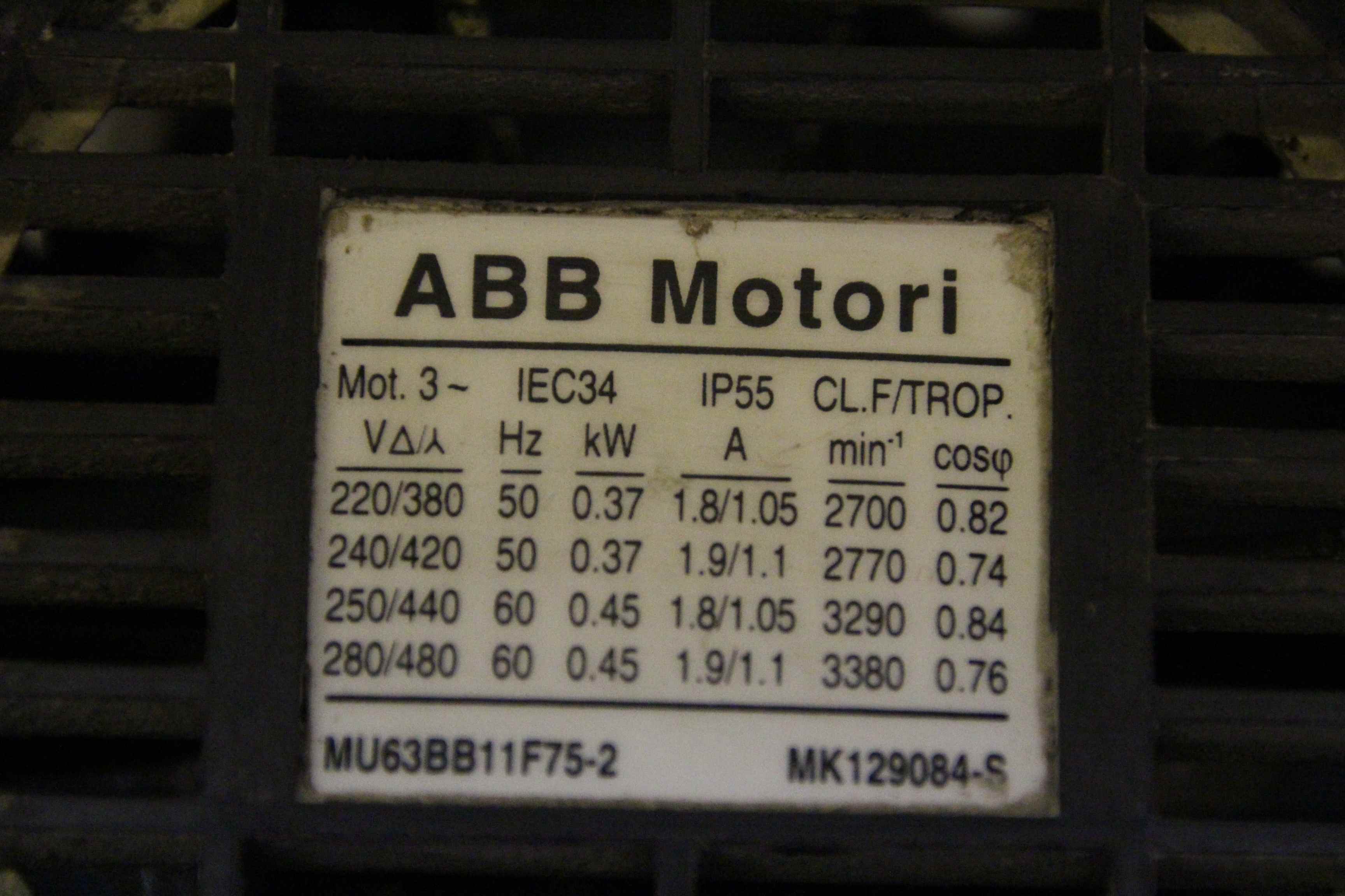 Three-phase motor, electric motor -Manufacturer: ABB Motori Type MU63BB11F75-2/MK129084-S -Power: 0.37 kW -Speed: 2700 rpm -Shaft: Ø 11 x 20 mm -Design: B5 -Protection class: IP 55 -Dimensions: 205/120/H150 mm -Weight: 4.3 kg