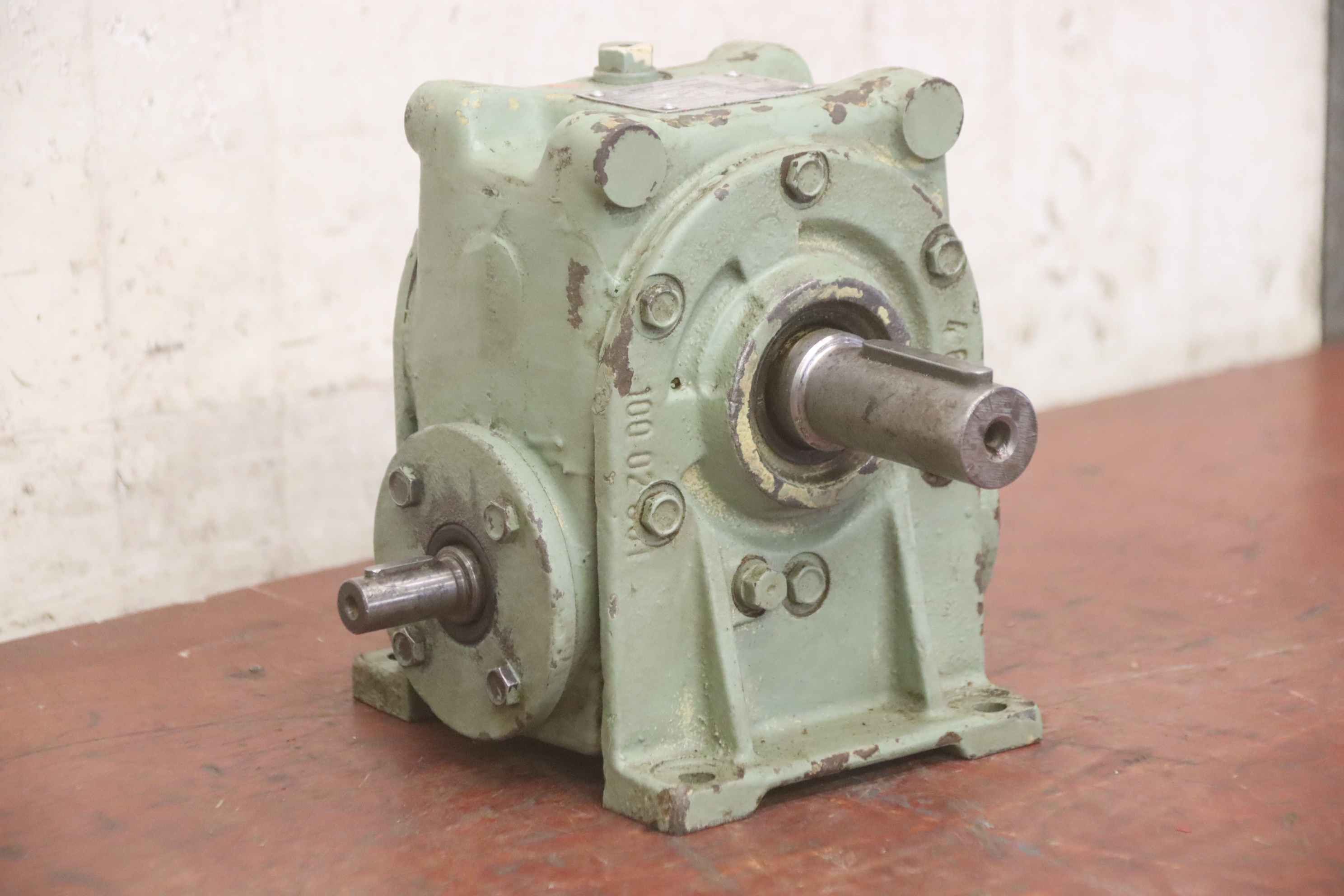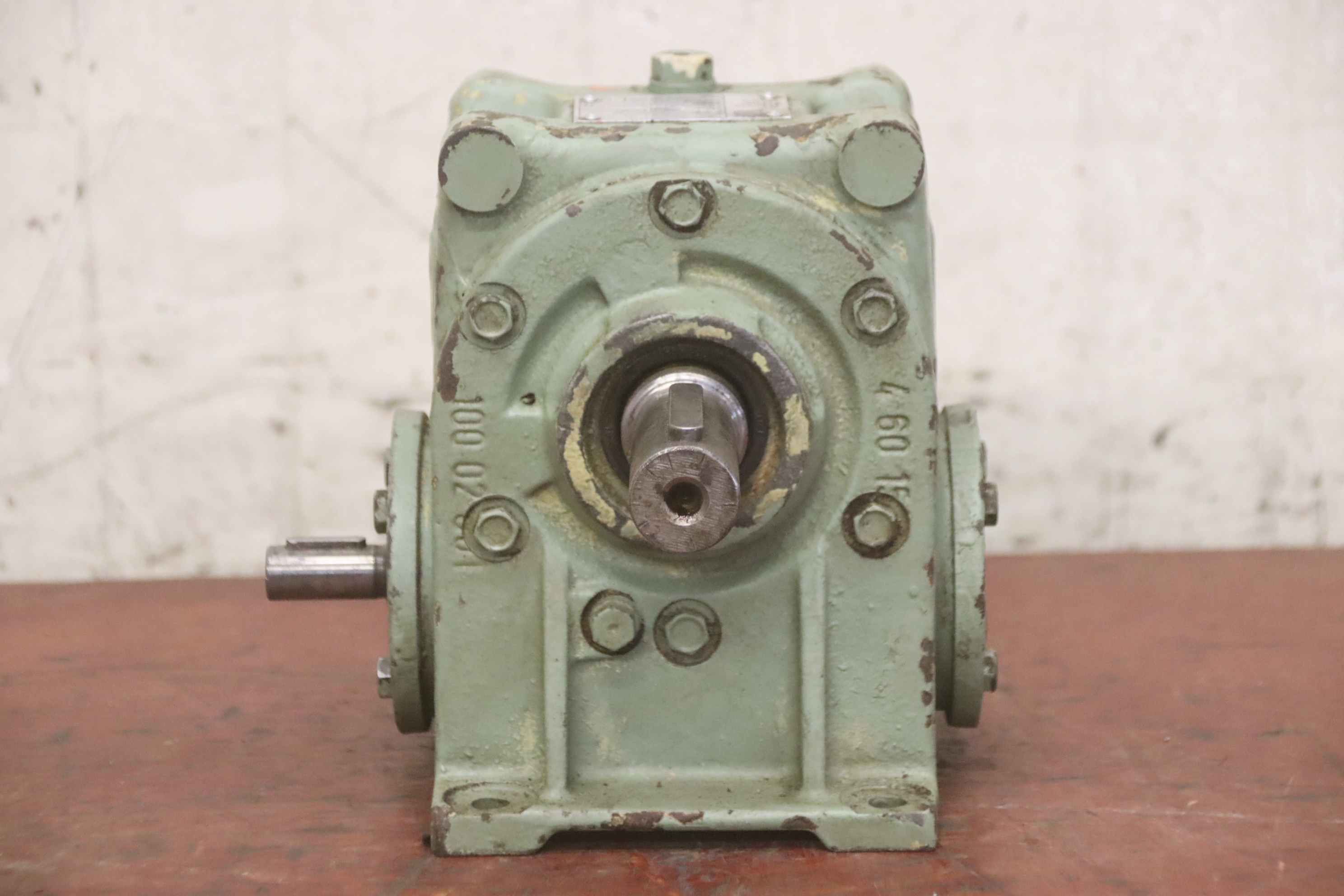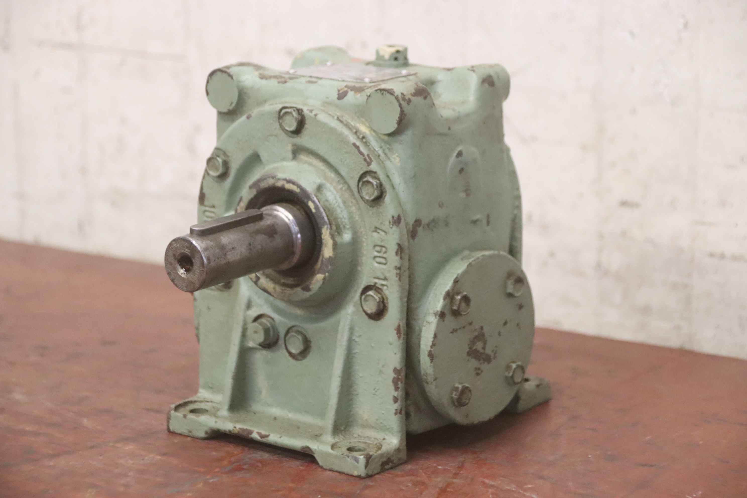 Gearbox, spur gear, angle gear, worm gear, adjustable gear motor-Manufacturer: VEB, type 10 UO-50x30 oLTGL 258/4-Translation: i = 30-Shafts: Ø 25 x 60 mm / Ø 14 x 30 mm-Number: 1x gearbox available-Price per piece-Dimensions: 200/180/H170mm-Weight: 9 kg/piece