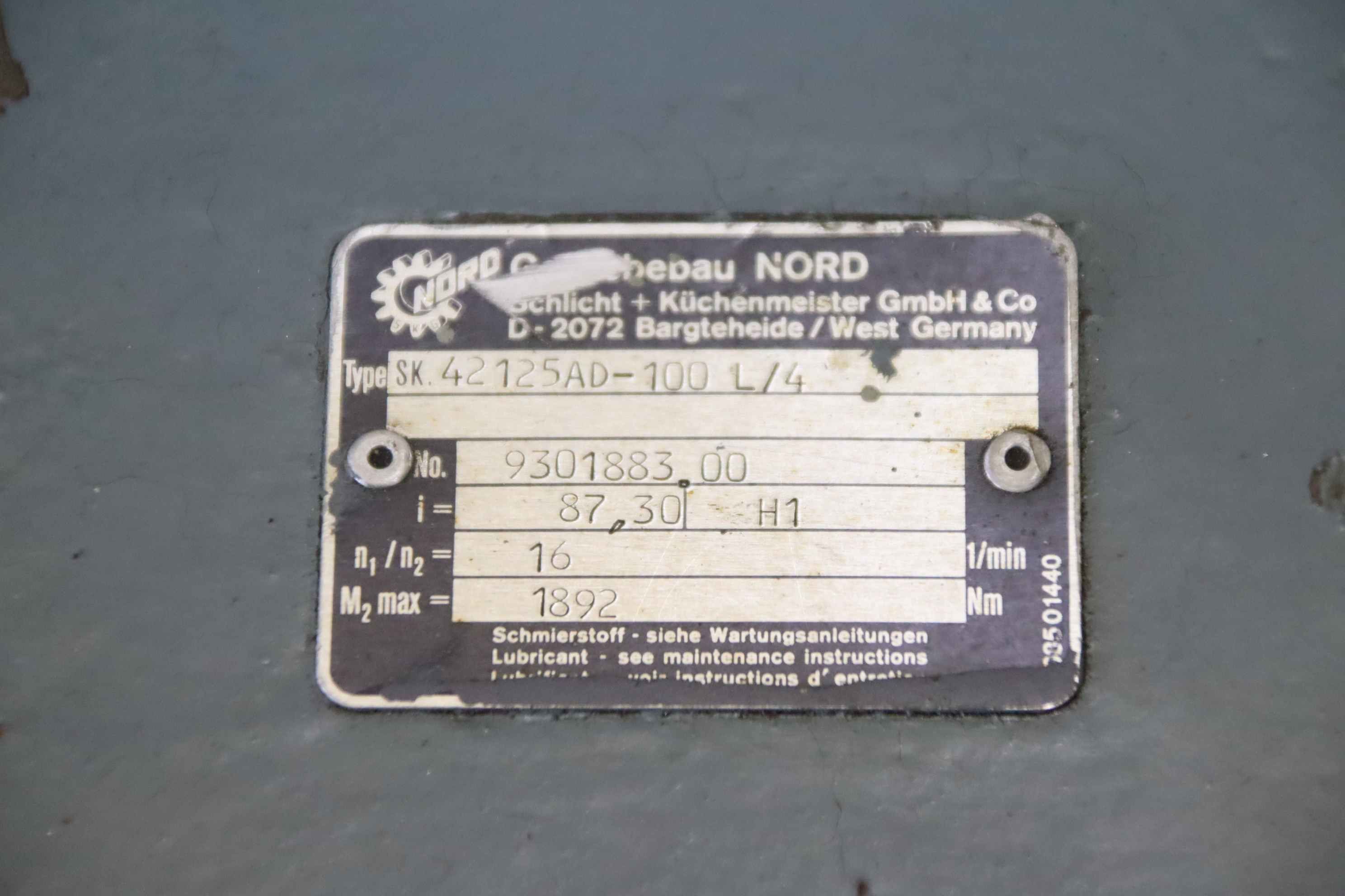 Gears, spur gears, bevel gears, worm gears-Manufacturer: Nord, gearbox type SK 42125AD-100 L/4-Translation: i = 87.30-Drive shaft: hollow shaft Ø 60 x 235 mm-M2 max: 1892Nm-Dimensions: 380/250/H470 mm-Weight: 101 kg