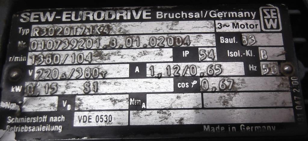 Gear motor, electric motor-Speed: 104 rpm-Power: 0.15 kW-Construction: B3-Diameter shaft: Ø 17 mm-Protection class: IP 54-Number: 1x motors available-Price: per piece-Dimensions: 315/195/H150 mm-Weight: 10.4 kg