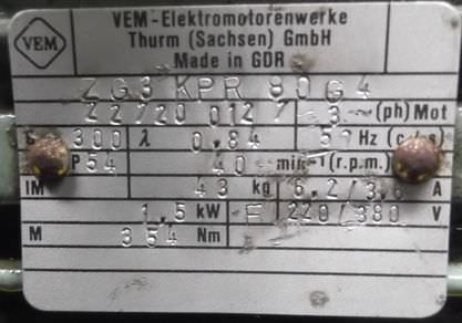Gear motor, electric motor, three-phase motor, electric gear motor-Engine manufacturer: VEM-Manufacturer gearbox: VEM-Speed: 40 rpm-Power: 1.5 kW-Construction: B5-Diameter shaft: 48 mm-Protection class: IP 54-Number: 2x motors available-Price: per piece-Dimensions: 620/250/H280 mm-Weight: 45 kg