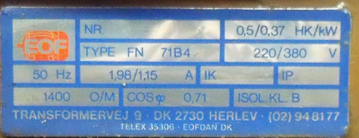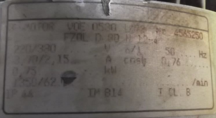 electric motor, three-phase motor -Power: 0.55 kW -Speed: 1400 rpm -Shaft diameter: 19 mm -Brake -Design: B5 -Protection class: IP 54 -Weight: 12 kg