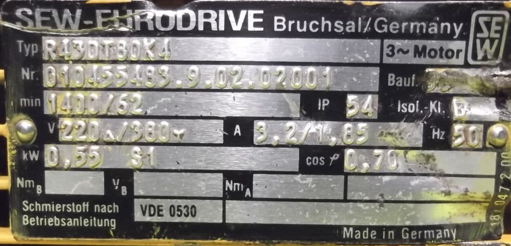 Geared motor, electric motor, electric geared motor -Manufacturer: VEM, Geared motor type ZG3 KMRA 80 G 6 -Speed: 31.5 rpm -Power: 0.55 kW -Design: B3 -Shaft: Ø 32 x 80 mm -Protection class: IP 44 -Number: 1x motor available -Price: per piece -Dimensions: 485/205/H235 mm -Weight: 25 kg/pc.