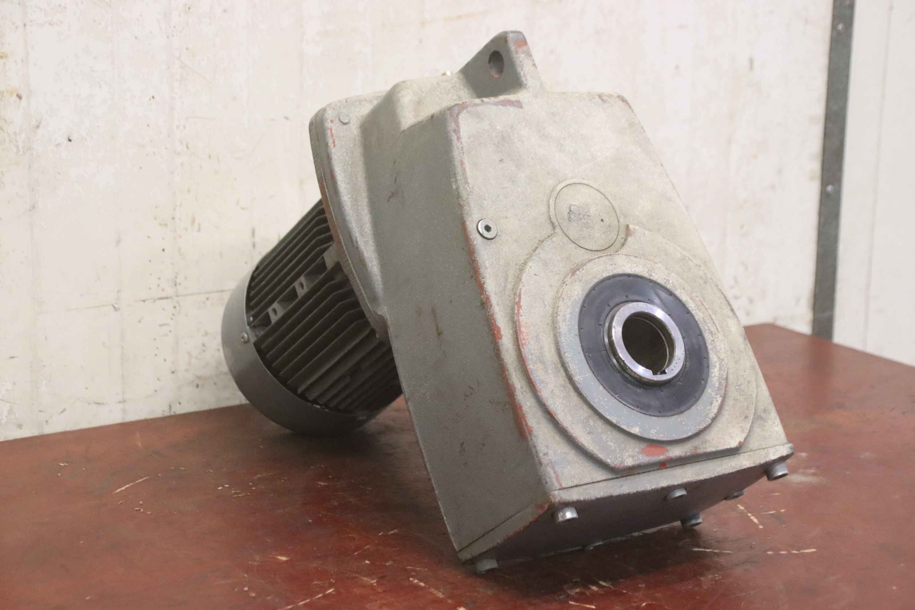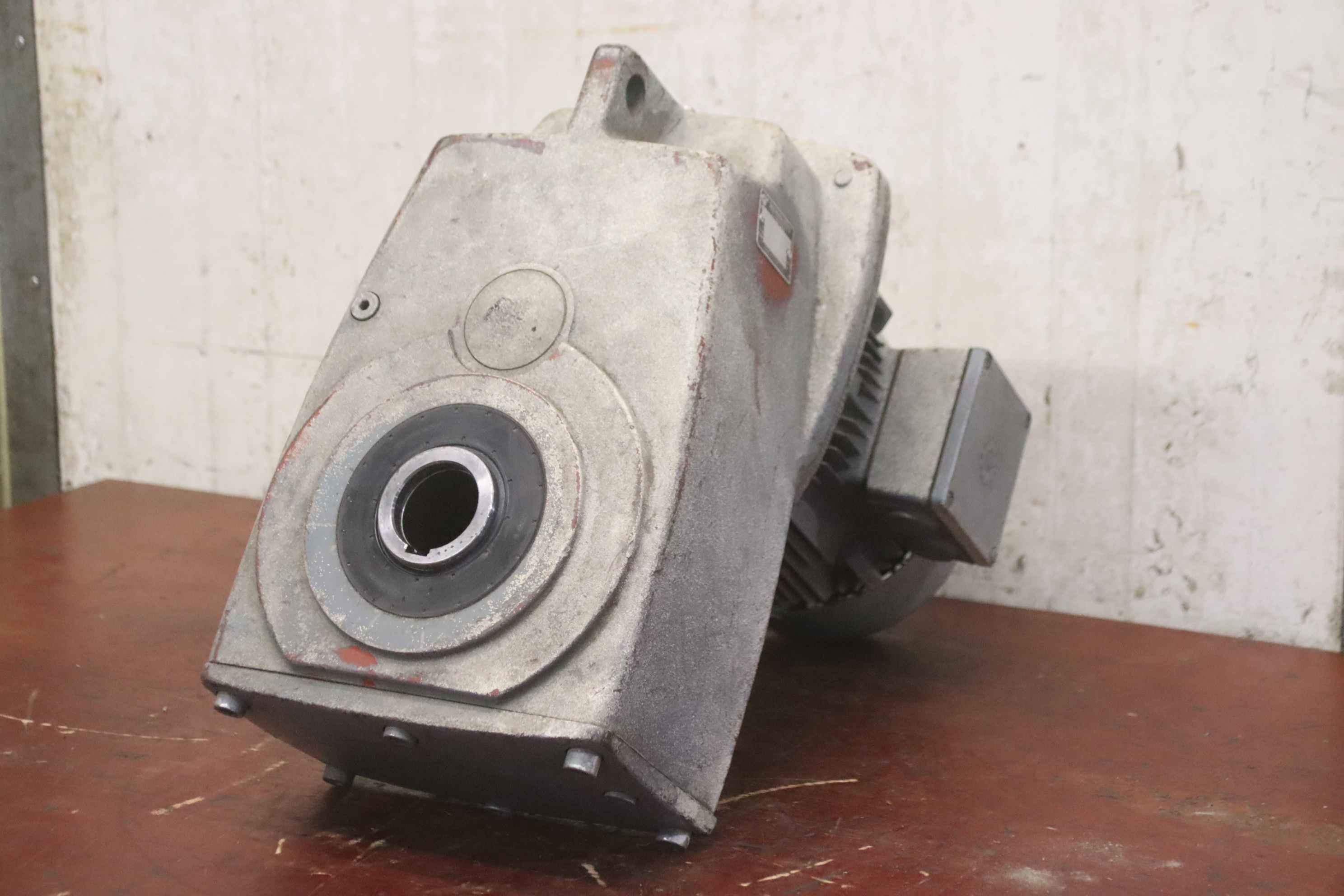 flat gear motor, geared motor, electric motor, electric geared motor, bevel geared motor -Manufacturer: Nord, gear motor -Type: SK 4282A-G-100 L/40 i = 43.65 -Speed: 33 rpm -Engine: Type SK 100 L/40 -Power: 3 kW / 1410 rpm -Hollow shaft: Ø 50 x 195 mm -Protection class: IP55 -Dimensions: 530/260/H465 mm -Weight: 85 kg