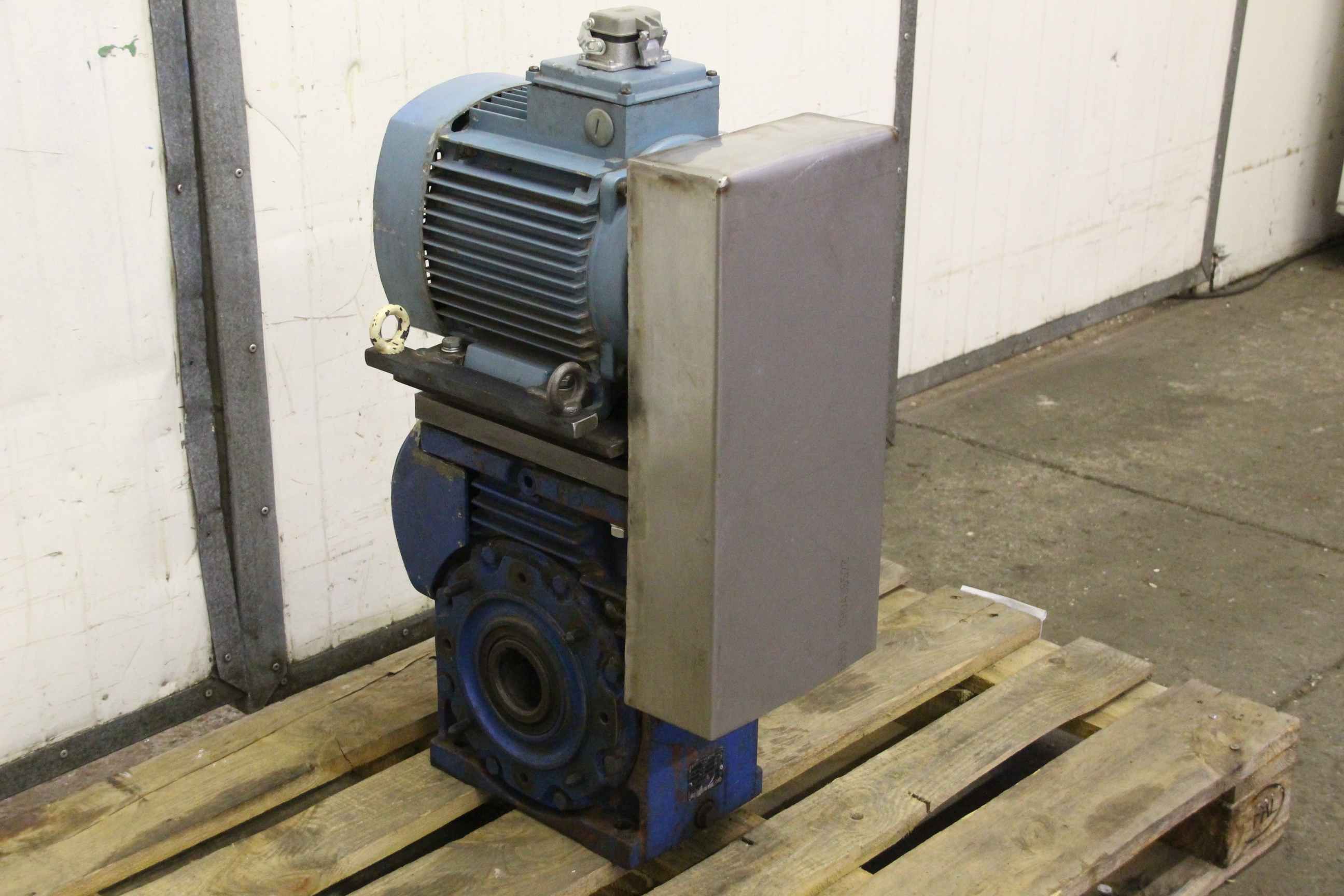 Gear motor, electric motor, electric gear motor-Transfer in current condition as seen-Speed: 27 rpm-Power: 0.37 kW-Construction: B3-Diameter shaft: 20 mm-Protection class: IP 55-Number: 1x motors available-Price: per piece-Dimensions: 510/160/H210 mm-Weight: 16 kg